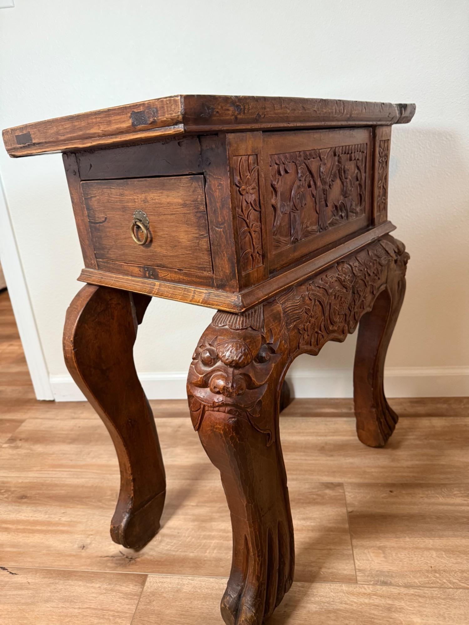 Beautifully hand-carved Asian table featuring intricate floral and animal motifs on the sides and legs, along with a functional drawer for storage. Measuring 24"D x 12"W x 28"T, this piece is the perfect size for use as an accent table or a unique focal point in any room. The detailed craftsmanship and unique design make this table a stunning addition to any home. Bidding on this lot is an agreement that: (1.) You will have 2 capable, able-bodied persons to lift and load at a minimum. (2.) You will bring a hand truck and/or any other tools needed to remove this item. If these steps are not followed your item will be forfeited and no refund given.