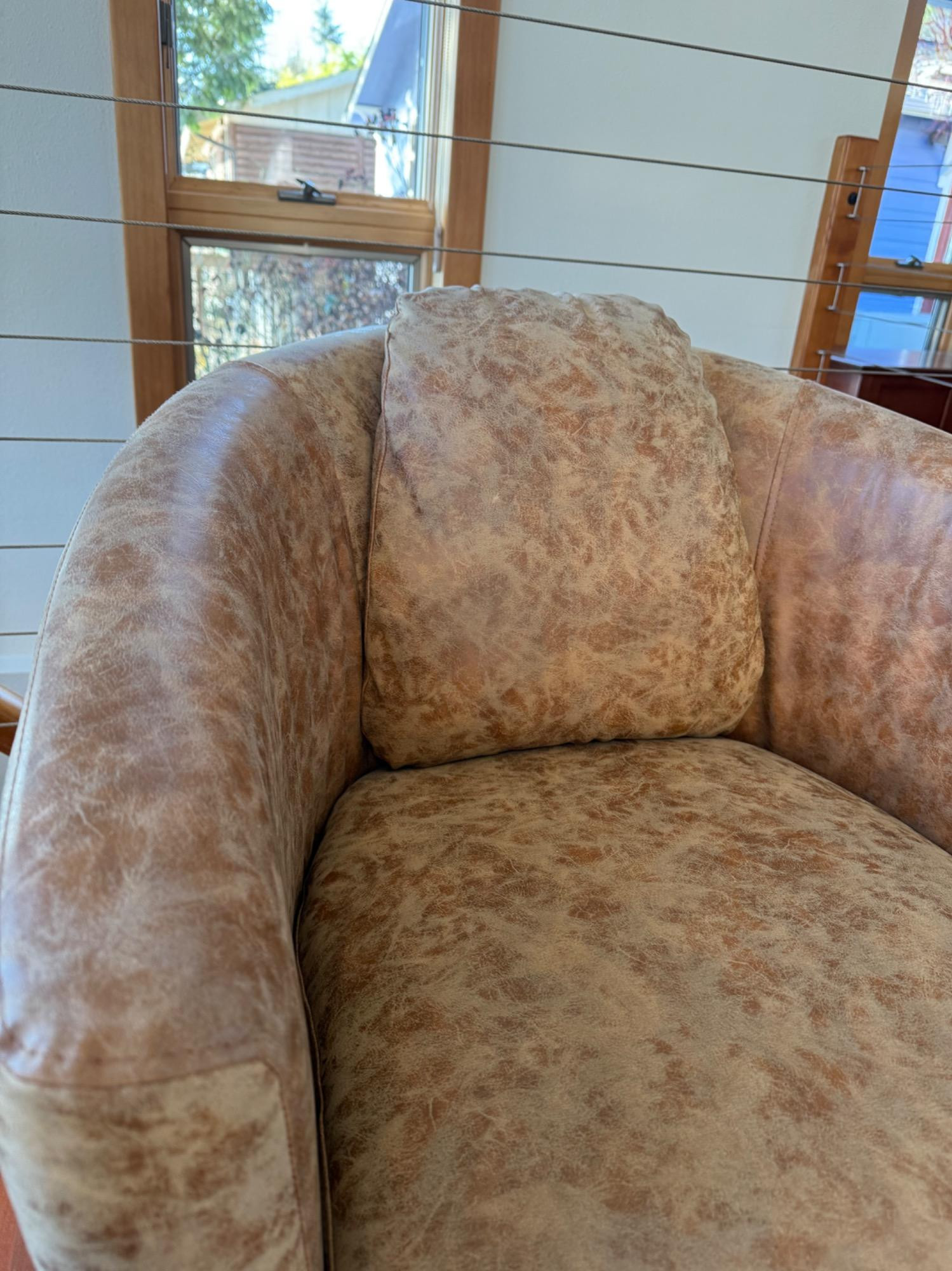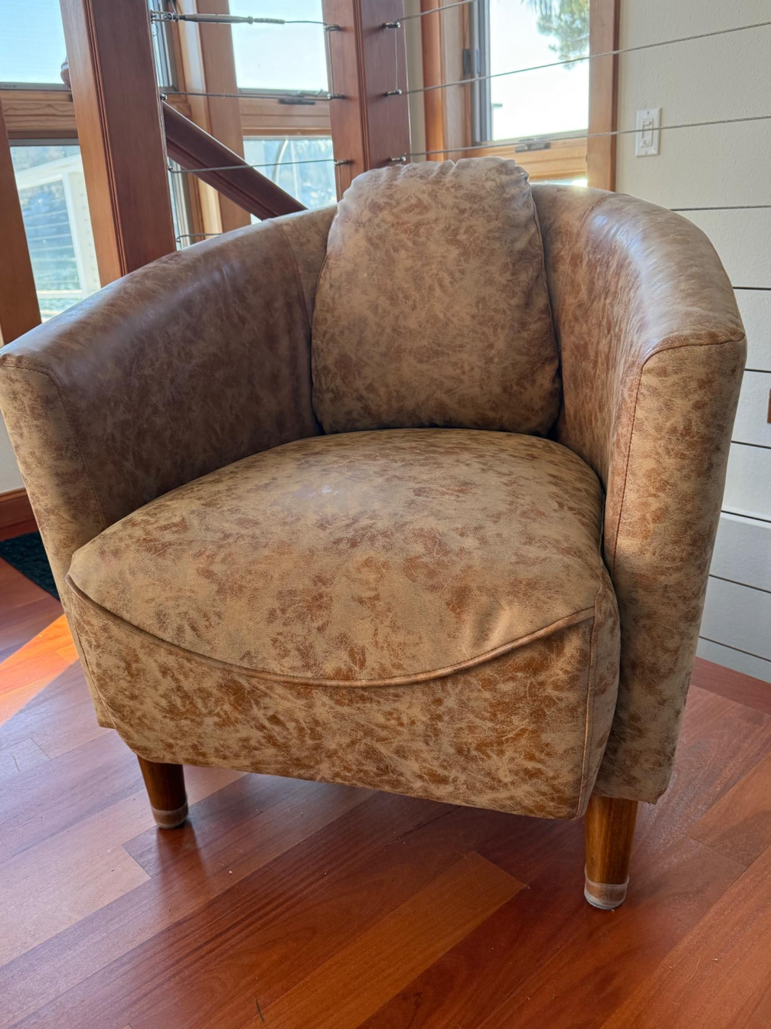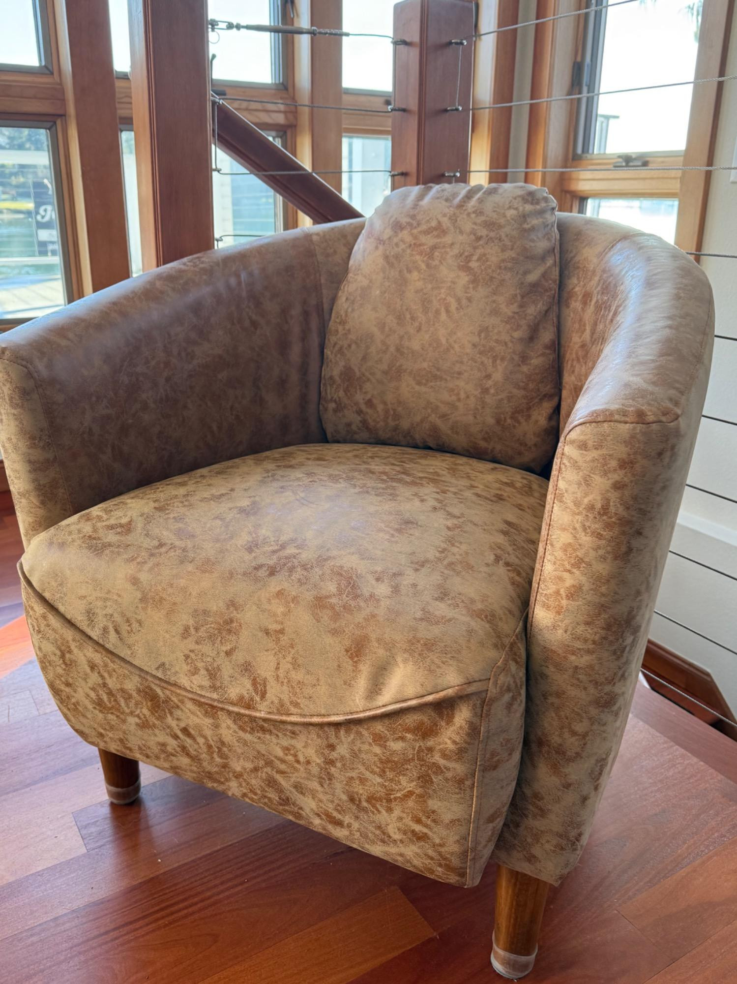 Stylish faux leather tub chair with the vintage look and feel of a baseball glove, adding a touch of relaxed refinement to any space. Measuring 29” tall, 29” wide, and 19” deep, it features foam-filled seating with coil spring and sinuous spring support for lasting comfort. Built with a solid wood frame for durability and shape retention, this chair is perfect for living rooms, reading nooks, or as an elegant accent piece. Bidding on this lot is an agreement that: (1.) You will have 2 capable, able-bodied persons to lift and load at a minimum. (2.) You will bring a hand truck and/or any other tools needed to remove this item. If these steps are not followed your item will be forfeited and no refund given.
