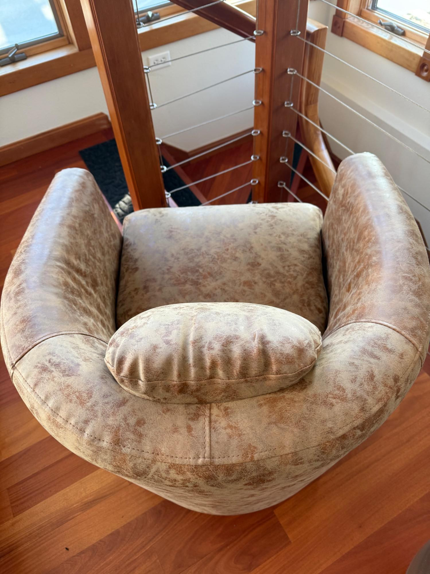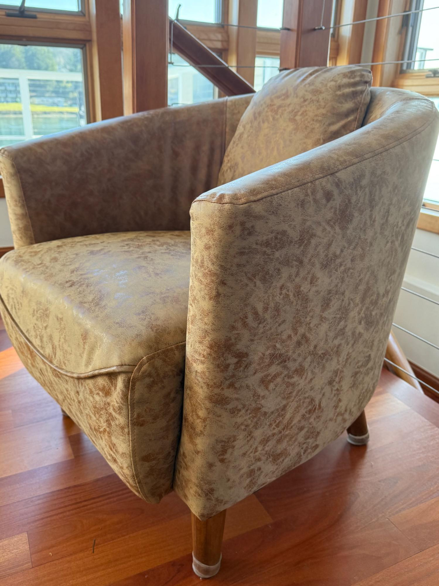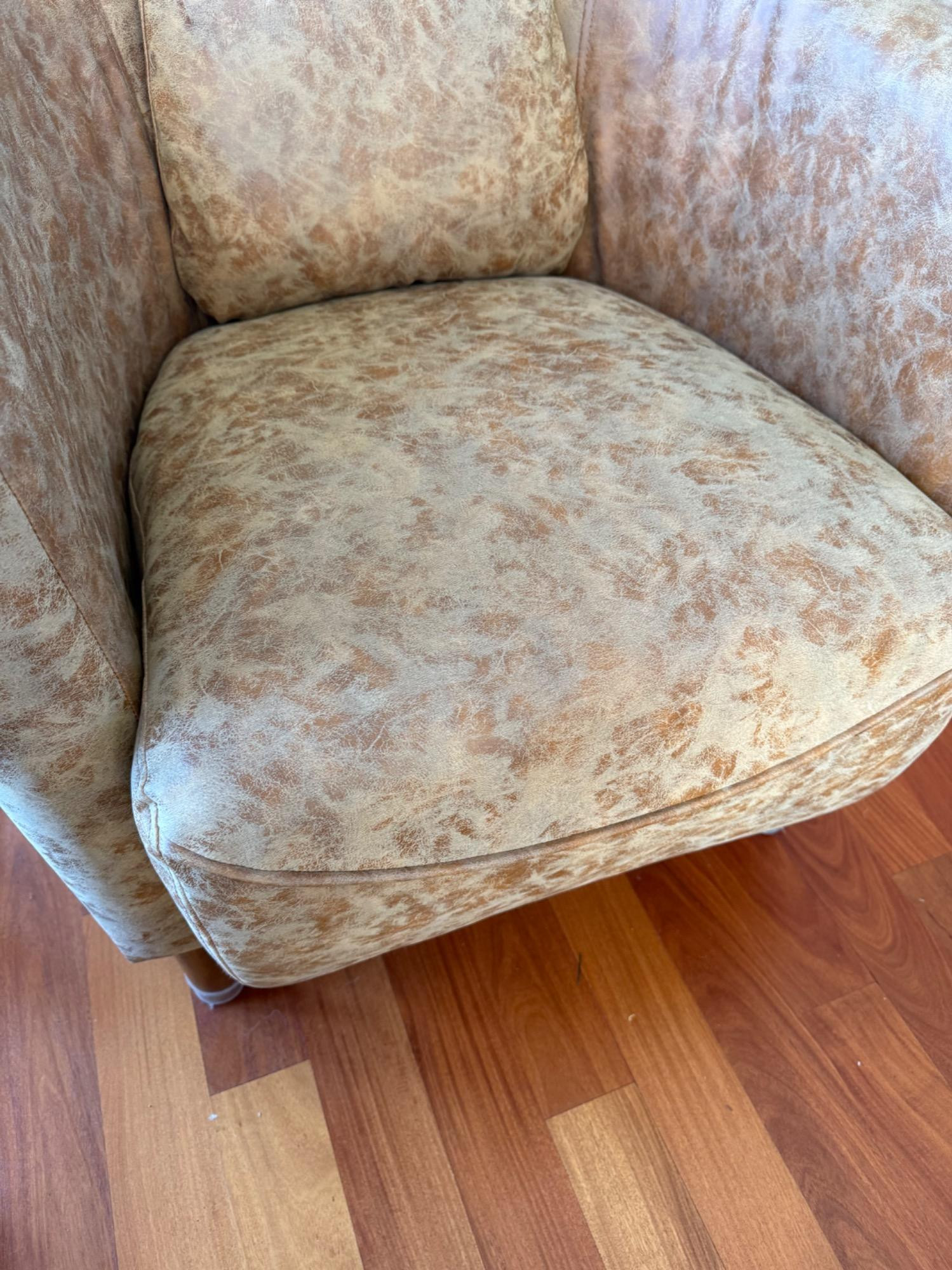 Stylish faux leather tub chair with the vintage look and feel of a baseball glove, adding a touch of relaxed refinement to any space. Measuring 29” tall, 29” wide, and 19” deep, it features foam-filled seating with coil spring and sinuous spring support for lasting comfort. Built with a solid wood frame for durability and shape retention, this chair is perfect for living rooms, reading nooks, or as an elegant accent piece. Bidding on this lot is an agreement that: (1.) You will have 2 capable, able-bodied persons to lift and load at a minimum. (2.) You will bring a hand truck and/or any other tools needed to remove this item. If these steps are not followed your item will be forfeited and no refund given.