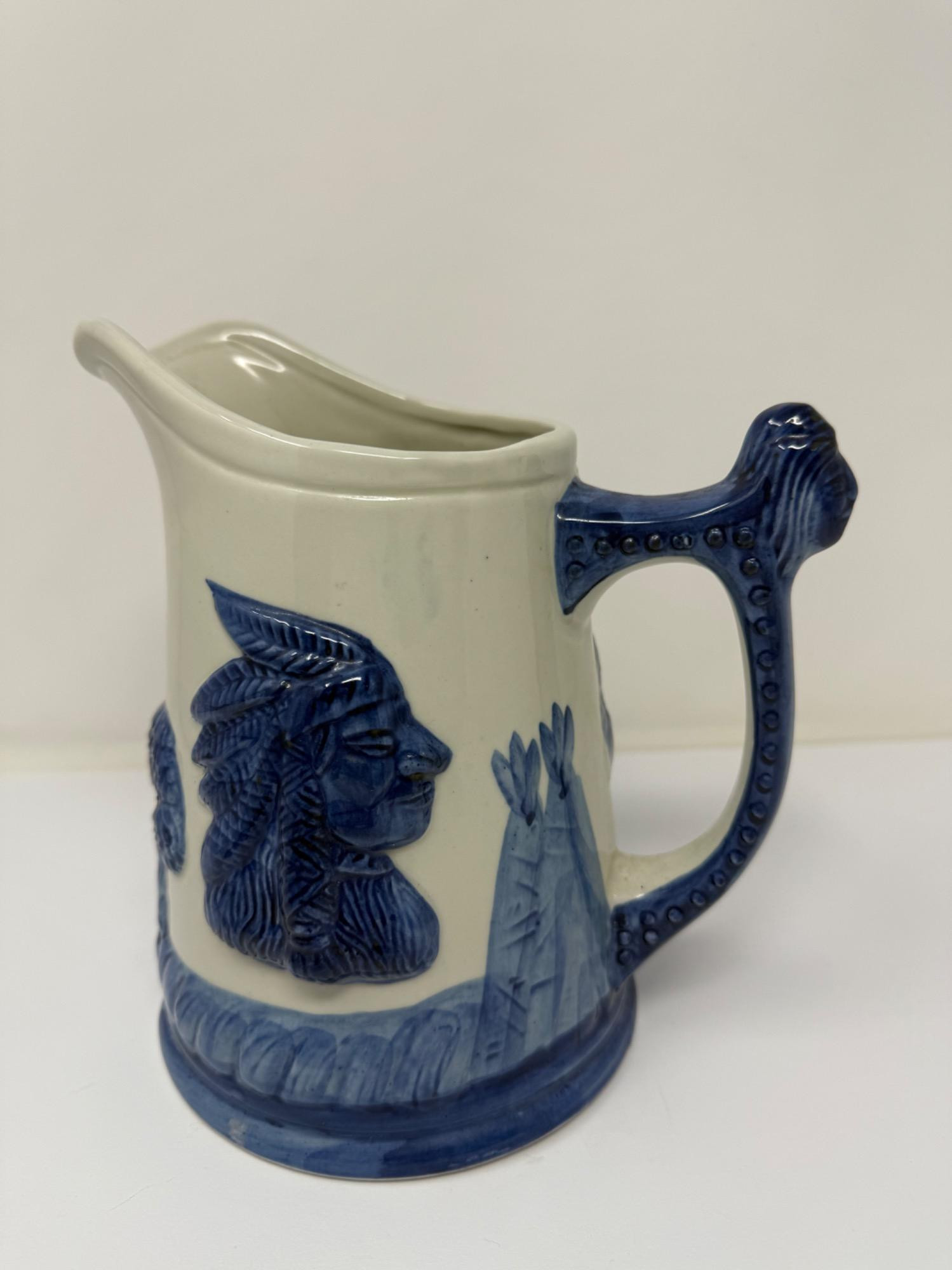 #2 Old Sleepy Eye Pottery Pitcher – 8" x 7.5" Classic Blue & Cream Iconic Sleepy Eye blue and white pitcher featuring a detailed Native American Chief motif on the sides. This classic piece measures approximately 8” tall by 7.5” wide, making it a substantial addition to any collection. The intricate design and rich cobalt blue details make this pitcher a standout display item or functional vintage collectible. Perfect for collectors of Sleepy Eye or Americana pottery.