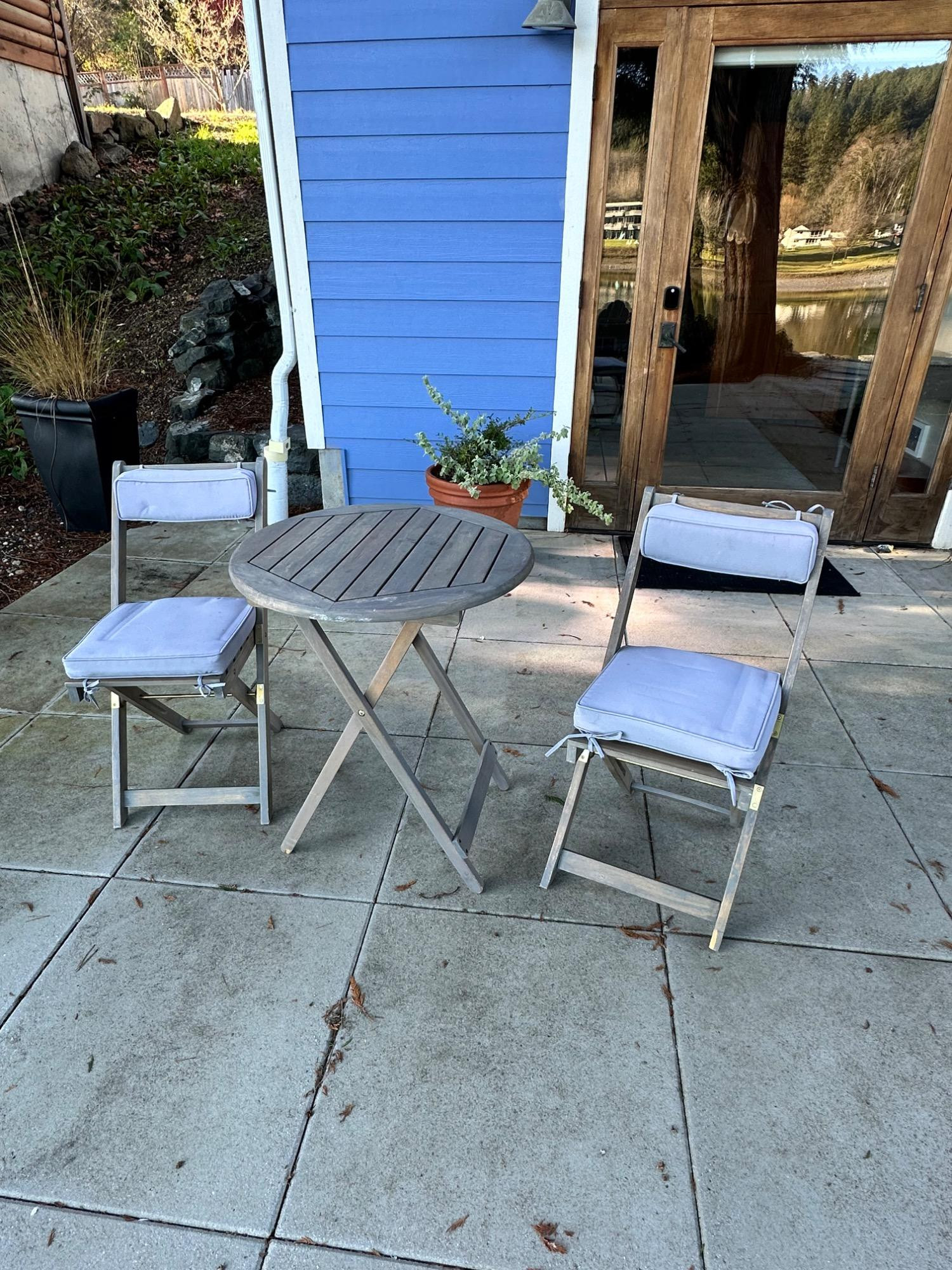 Lot # 83 - Charming Weathered Bistro Set w/ Folding Chairs & Cushions