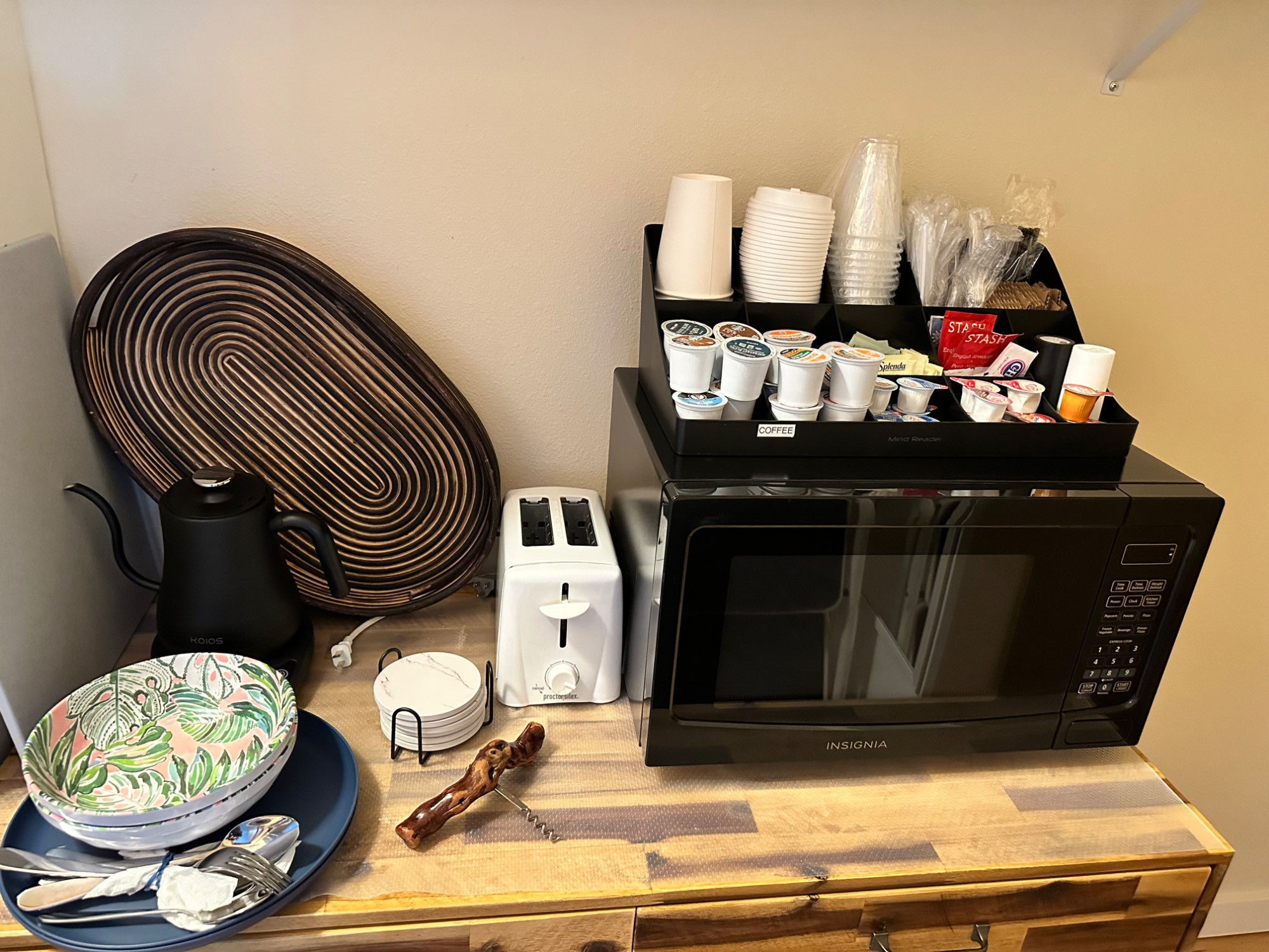 This convenient kitchen essentials lot includes an INSIGNIA Countertop Microwave (12" H x 20" W x 14" D), a KOIOS Electric Gooseneck Kettle, and a PROCTOR SILEX 2-Slice Cool-Wall Toaster, along with a coffee caddy organizer, a decorative wooden tray, a wine opener, and vibrant dishware. A perfect package for your home, apartment, or VRBO setup!