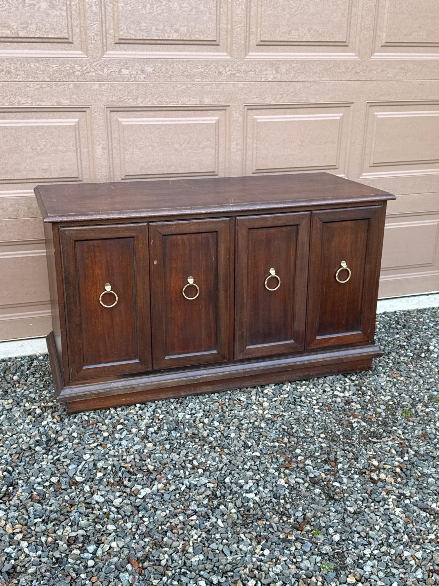 Vintage Credenza/Media Cabinet. Polish, or paint. Solid wood with brass hardware. Plenty of storage options inside! Bidding on this lot is an agreement that: (1.) You will have at least 2 capable, able bodied persons to lift and load at a minimum. (2.) You will bring a hand truck and/or any other tools needed to remove this item. If these steps are not followed your item will be forfeit and no refund given.