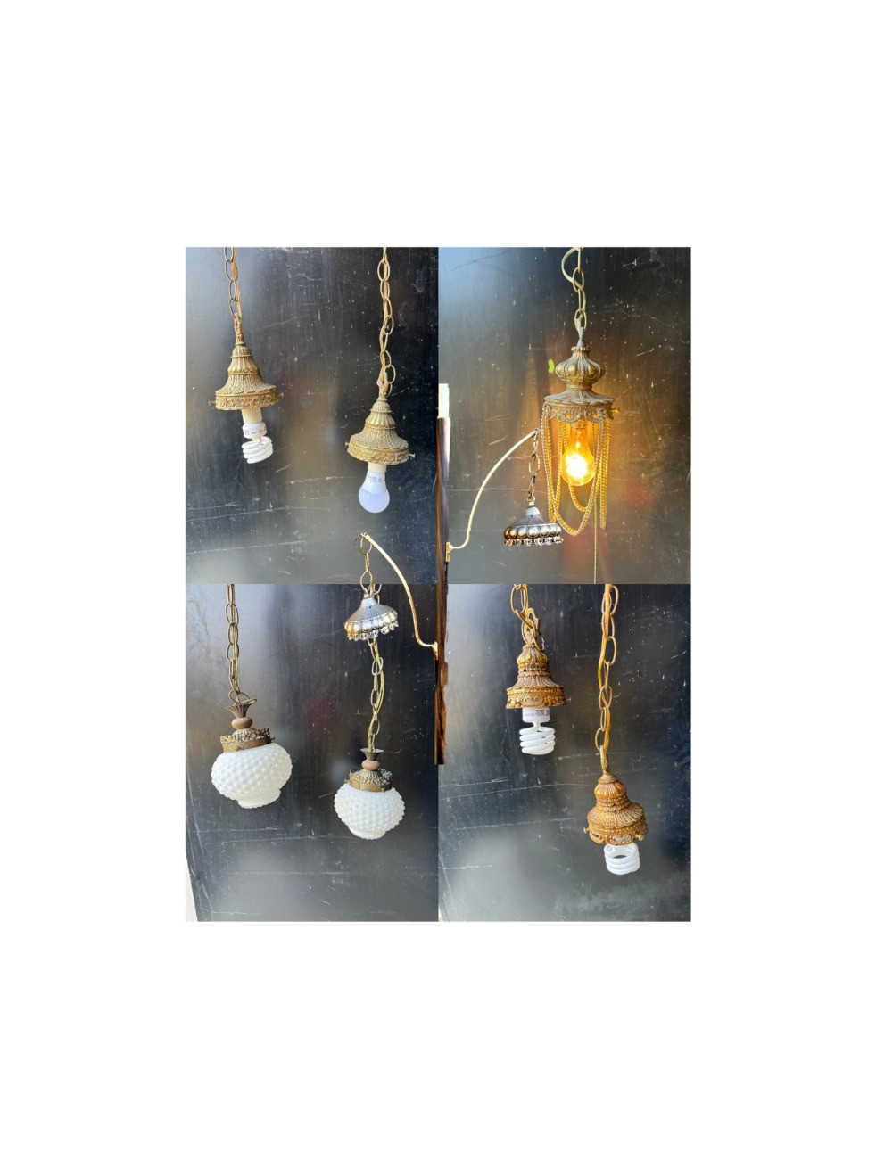 Box of Vintage Misc. Light Fixtures & Parts All pieces are metal- 3 1/2 x 4” before shade or lightbulb. Pole lamp roughly 81” before tension leg (needs rewiring) *one plug in fixture, rest are hardwired
