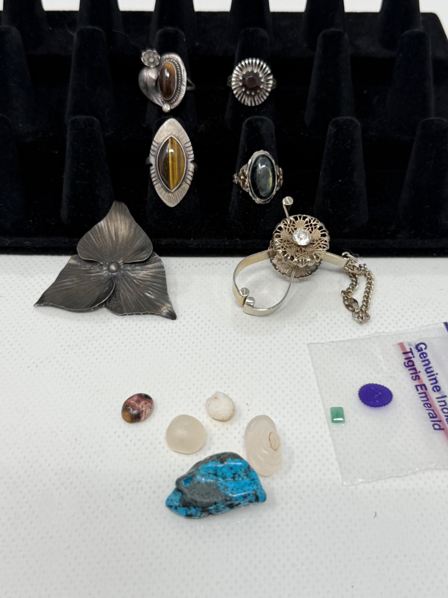 Sterling Silver rings, pin and glove clip. Glove clip is undetermined if sterling silver. Two weights were taken with and without glove clip. 26 and 39 ounces Ring sizes are 6.5, 7, 7.5. Tigers eye, amber/red stone and green stone. Sterling Trillium leaf pin. Assorted polished stones. One is Turquoise.