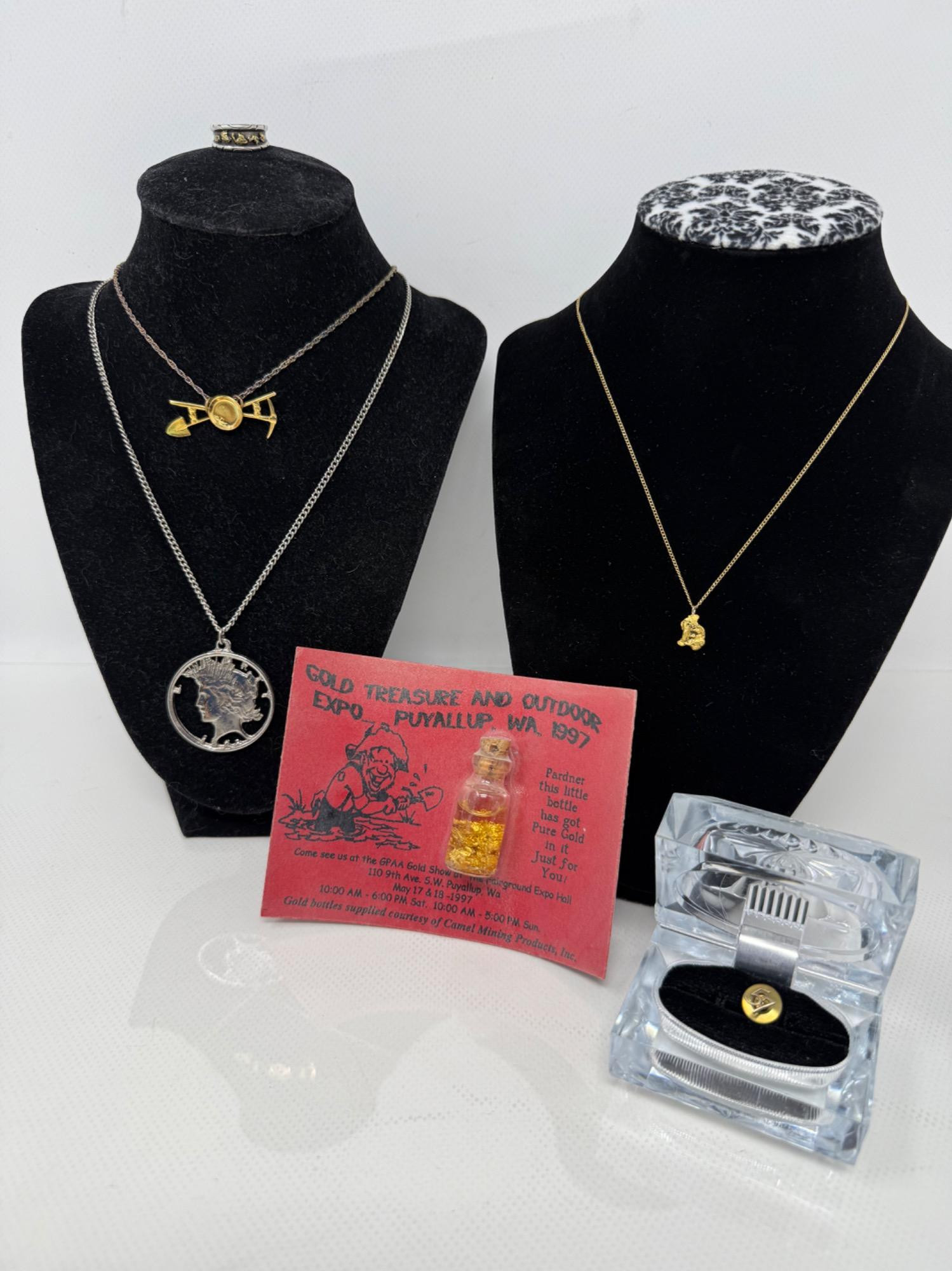 Mix of nugget and vintage styled jewelry. Vial of gold flakes, Small bead with floating flakes. Necklace with nugget pendant is 7ounces. Miners necklace and coin pendant necklace. "57" tie tack/pin Gold nugget on silver ring. Size 7