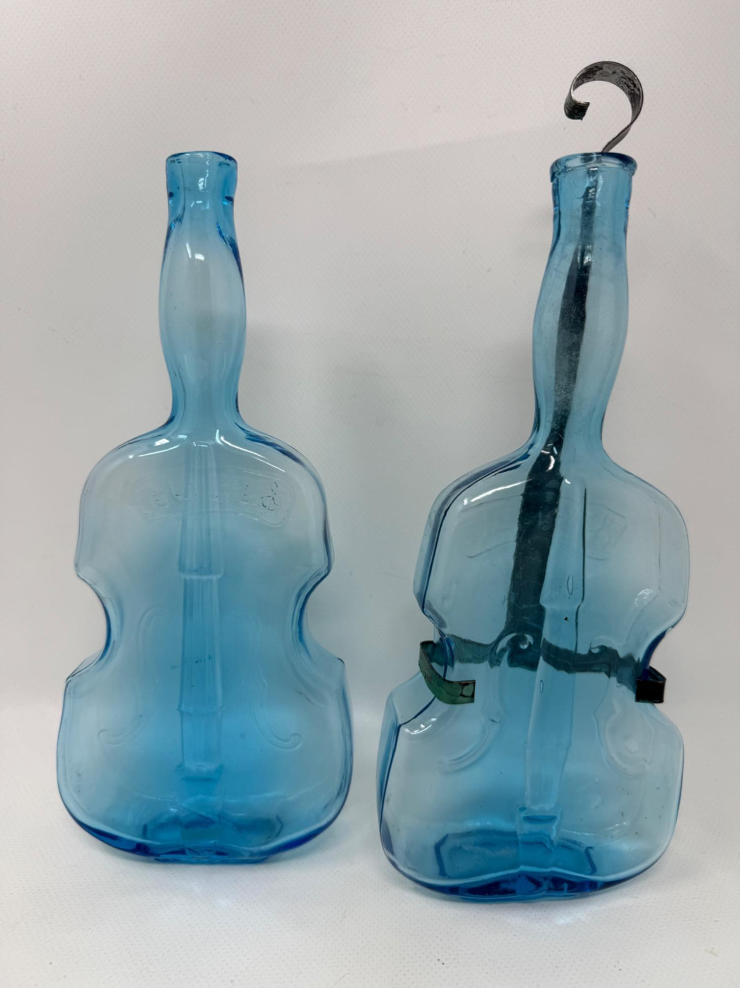 Vintage Light blue violin bottles. One with attached mounting hook. Maker unknown. Music sheet detail on back.