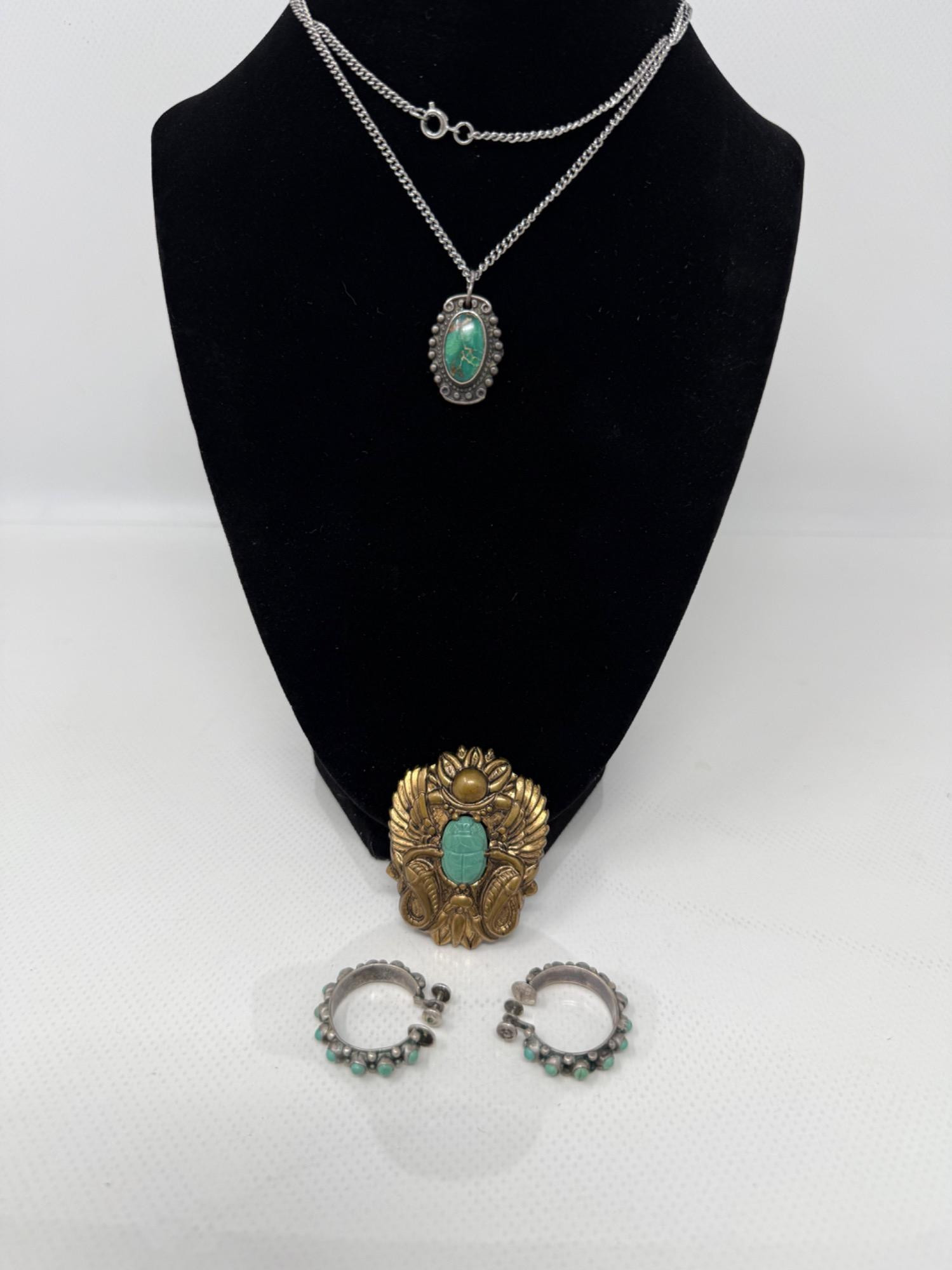 Sterling Silver, Turquoise and Green Stone Jewelry Sterling weight is 18ounces Brass pin with green scarab plastic center.