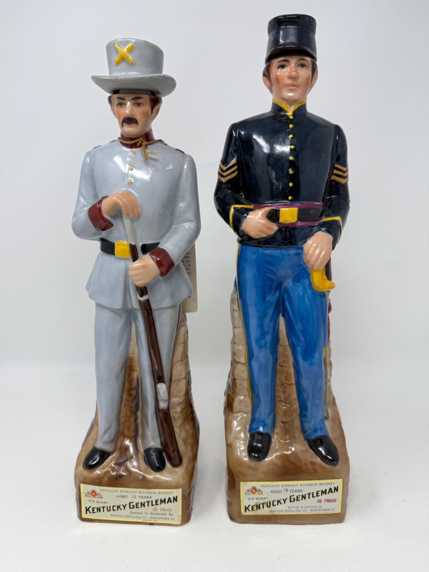 Jim Beam Decanters with Civil War Soldiers. Barton Ceramic bottles for Kentucky Gentleman Bourbon 13.5 and 14.25in tall