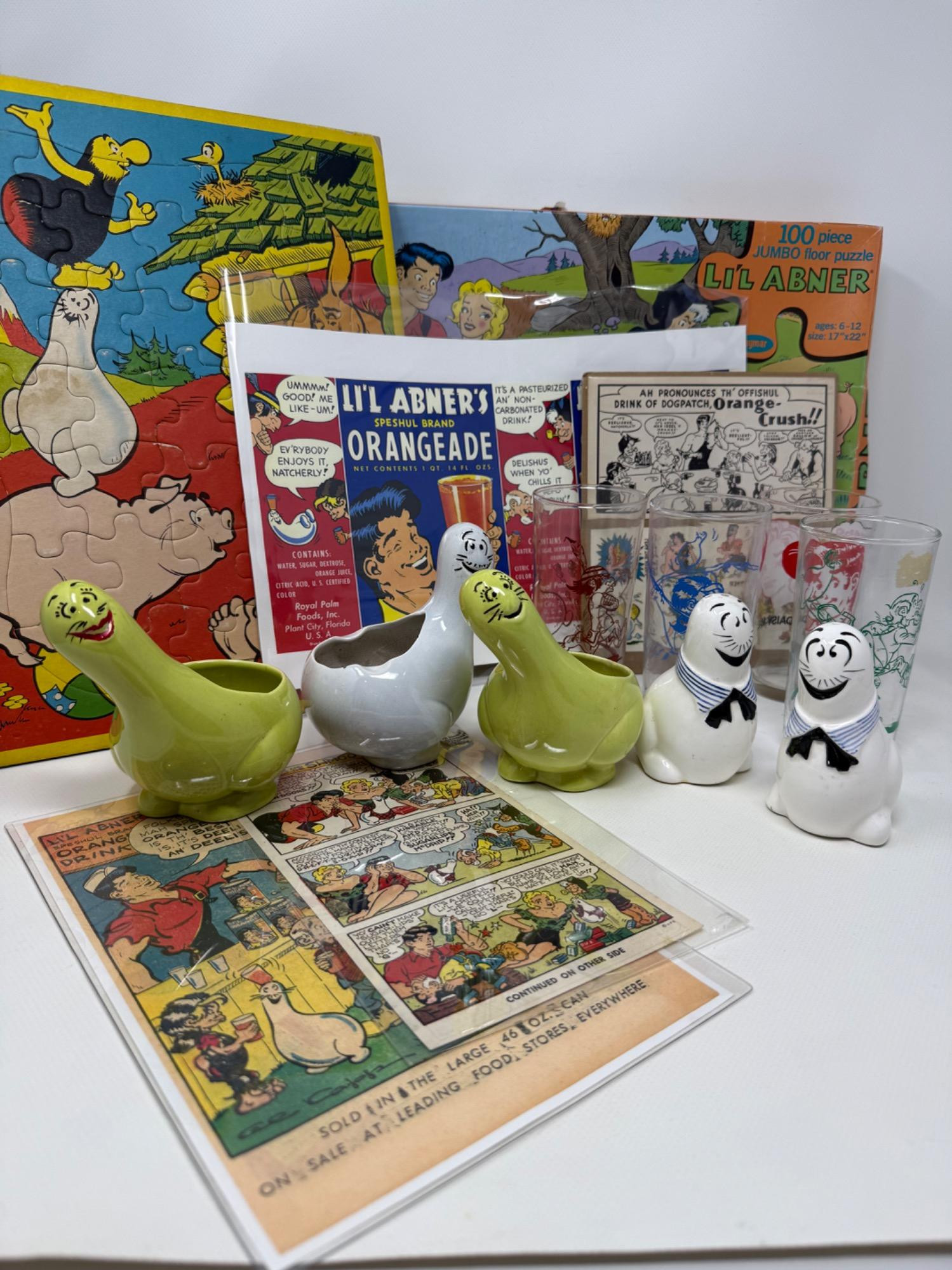 Shmoo and Lil Abner Vintage Collection-Rare Contest Tearaway 4 cartoon tumblers, advertisements, puzzle, S/P shakers, ashtray and more