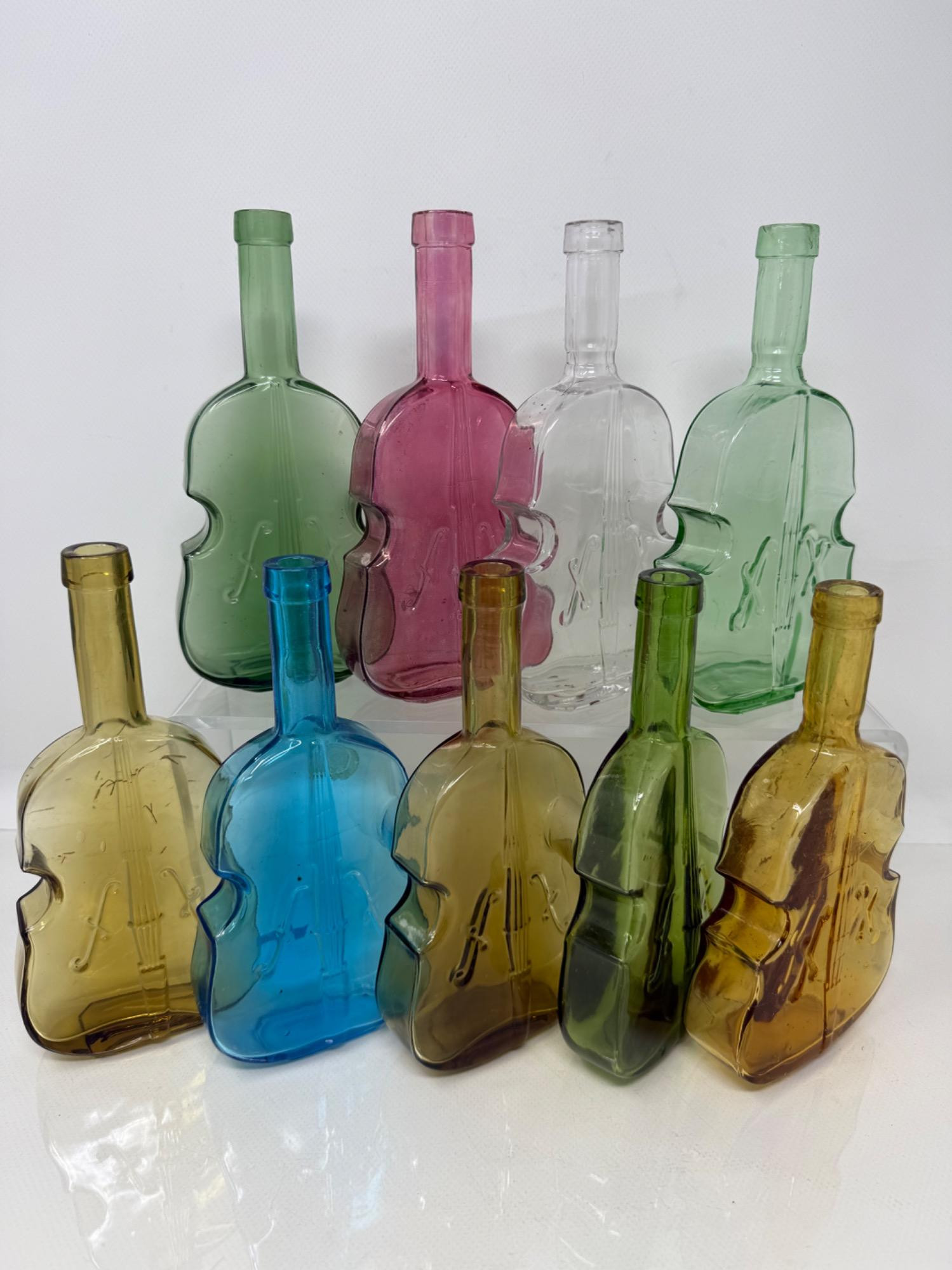 Colorful collection of violin bottles. Includes a bundle of mounting hooks. Clear, bold blue, pink, lime, amber, green, smokey brown, emerald. Raised violin detail on front.