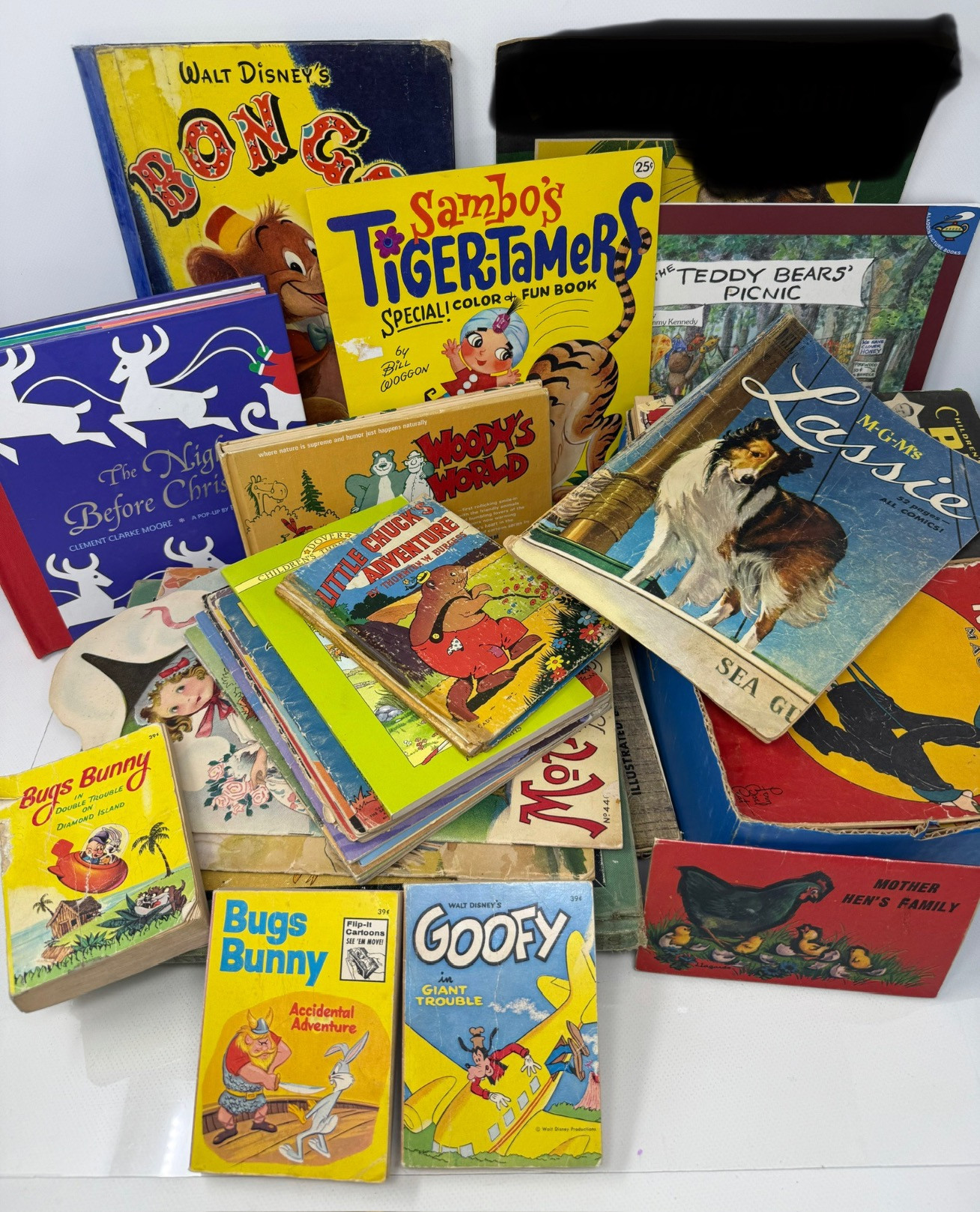 Vintage Children’s Books and Comics Box full of Playmate magazines. Classic children's story books-Bongo, Looney Tunes, Mother Goose, Robinson Crusoe and more.