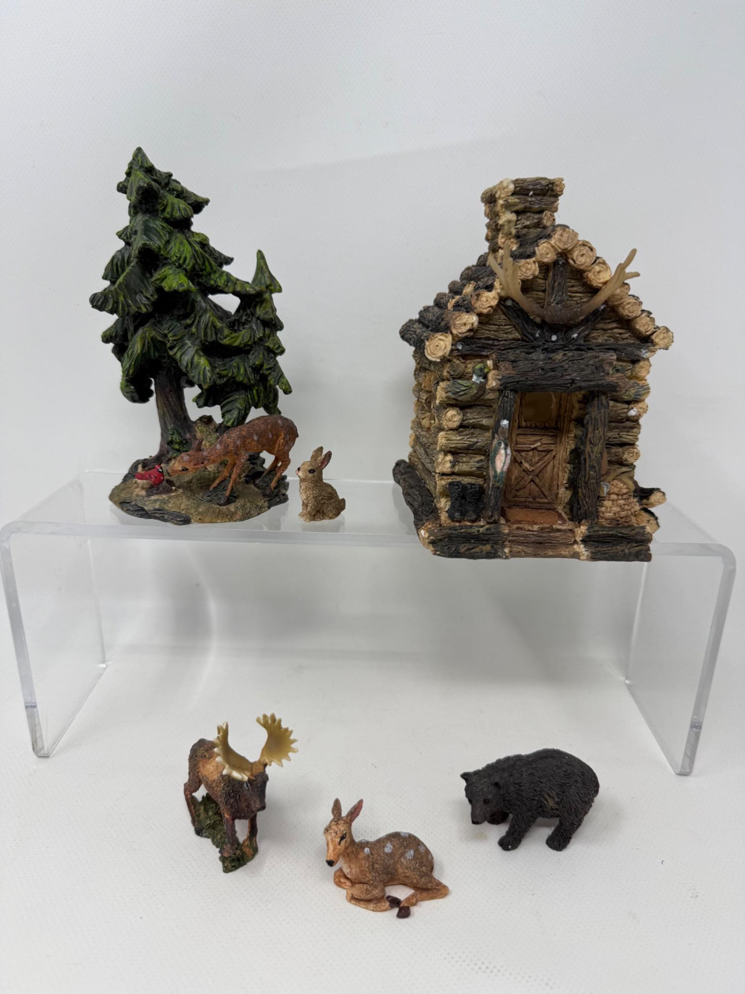 Thomas Clark Collection-Log Cabin, Tree and Animals Resin material hand carved by Thomas Cark. Retired pieces. Log cabin is lamp capable
