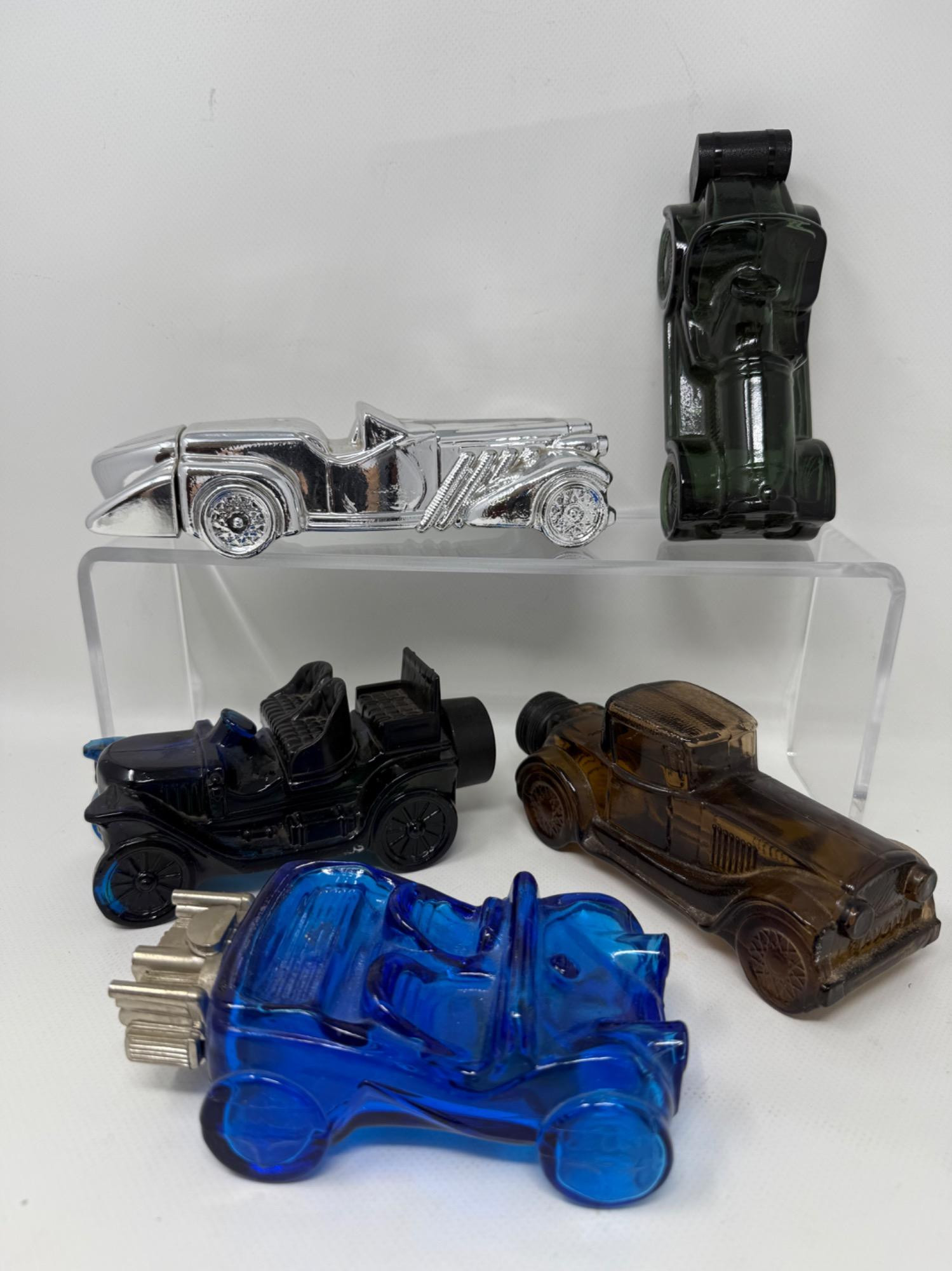 Vintage collection of cologne by Avon Silver Duesenberg is 8in long, Dark green bottle looks black. Brown, electric blue and deep blue glass bottles.