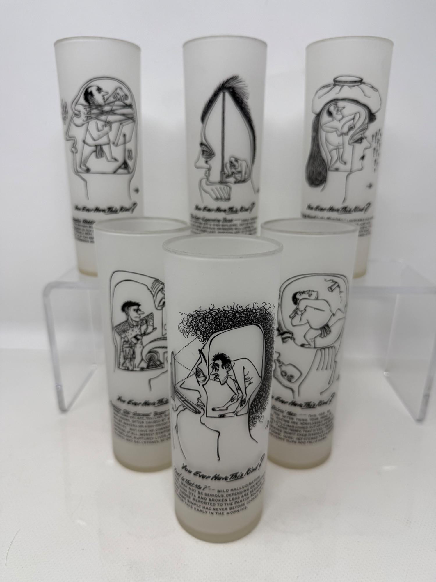 Six Vintage 1950's Virgil Partch Frosted Hiballs "Headache" glasses with graphic art.