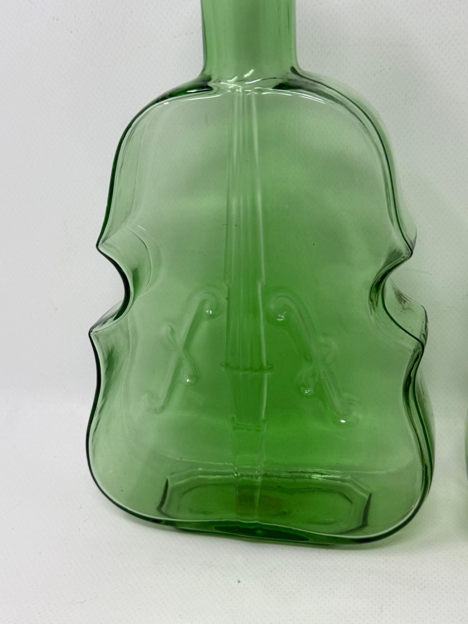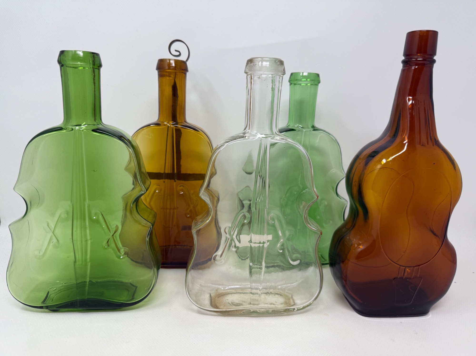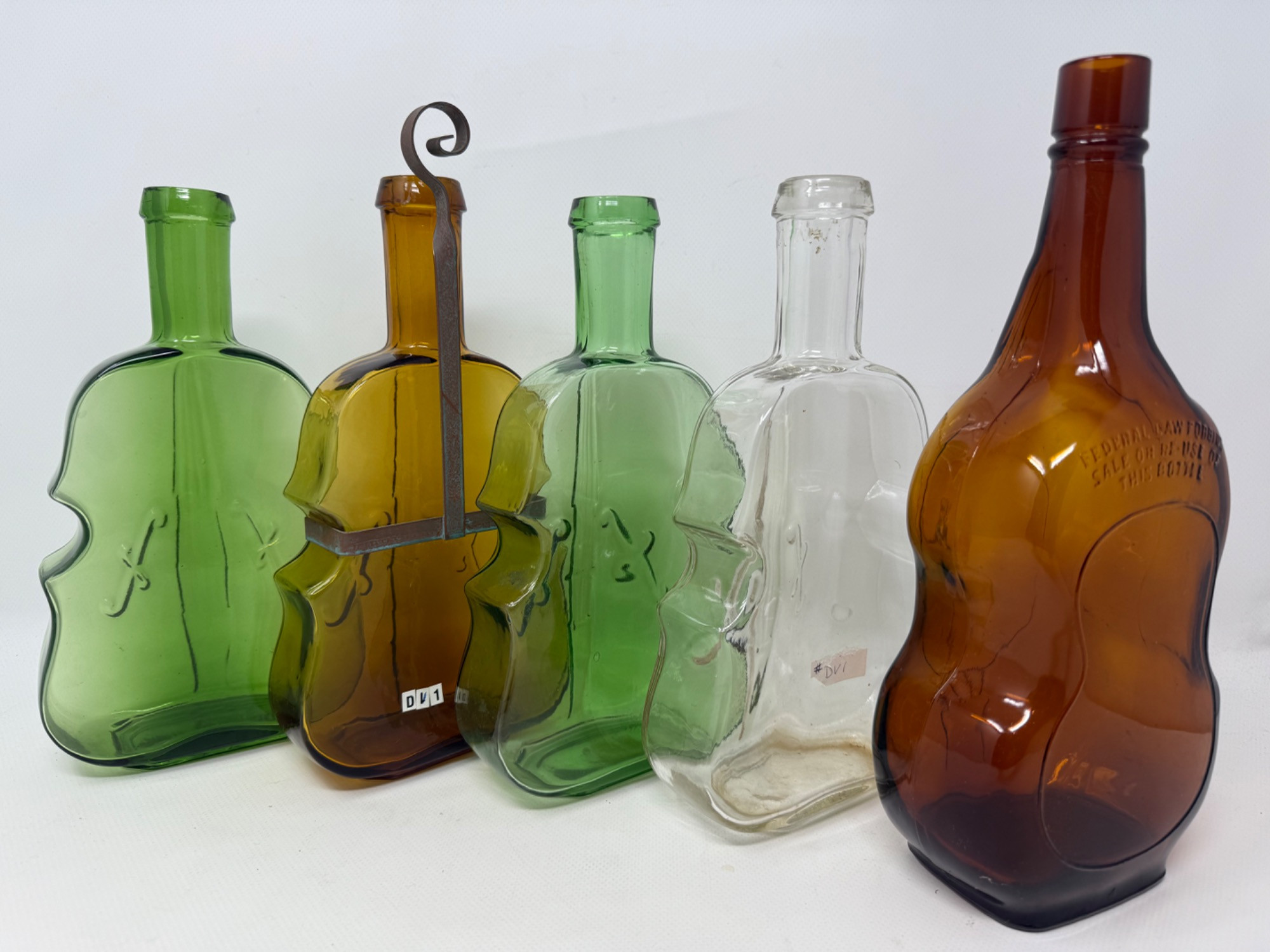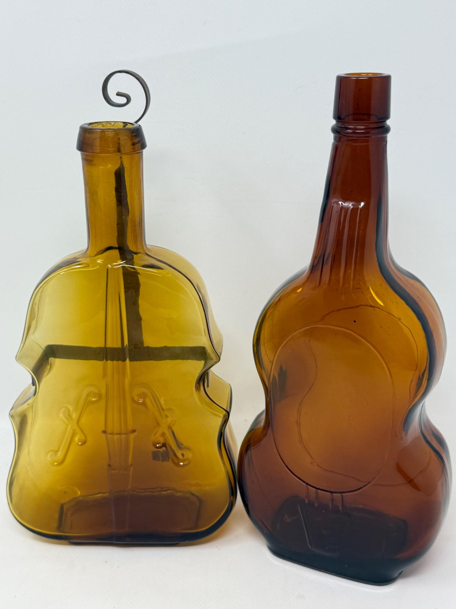 Large violin bottles. Clear, green, amber. One hook included. Average is 11in tall. Vintage styles bottle rims. One is a vintage liqueur bottle