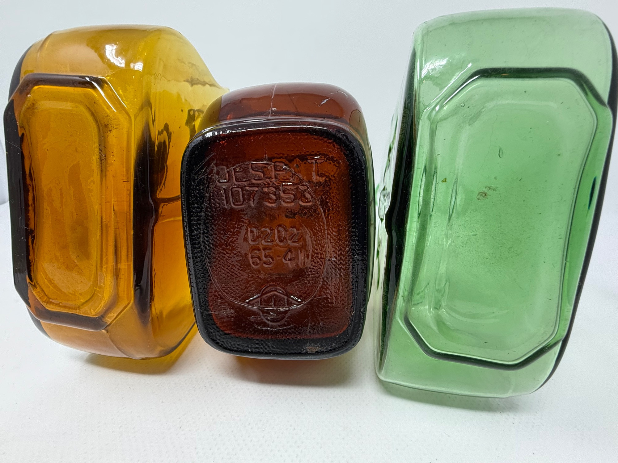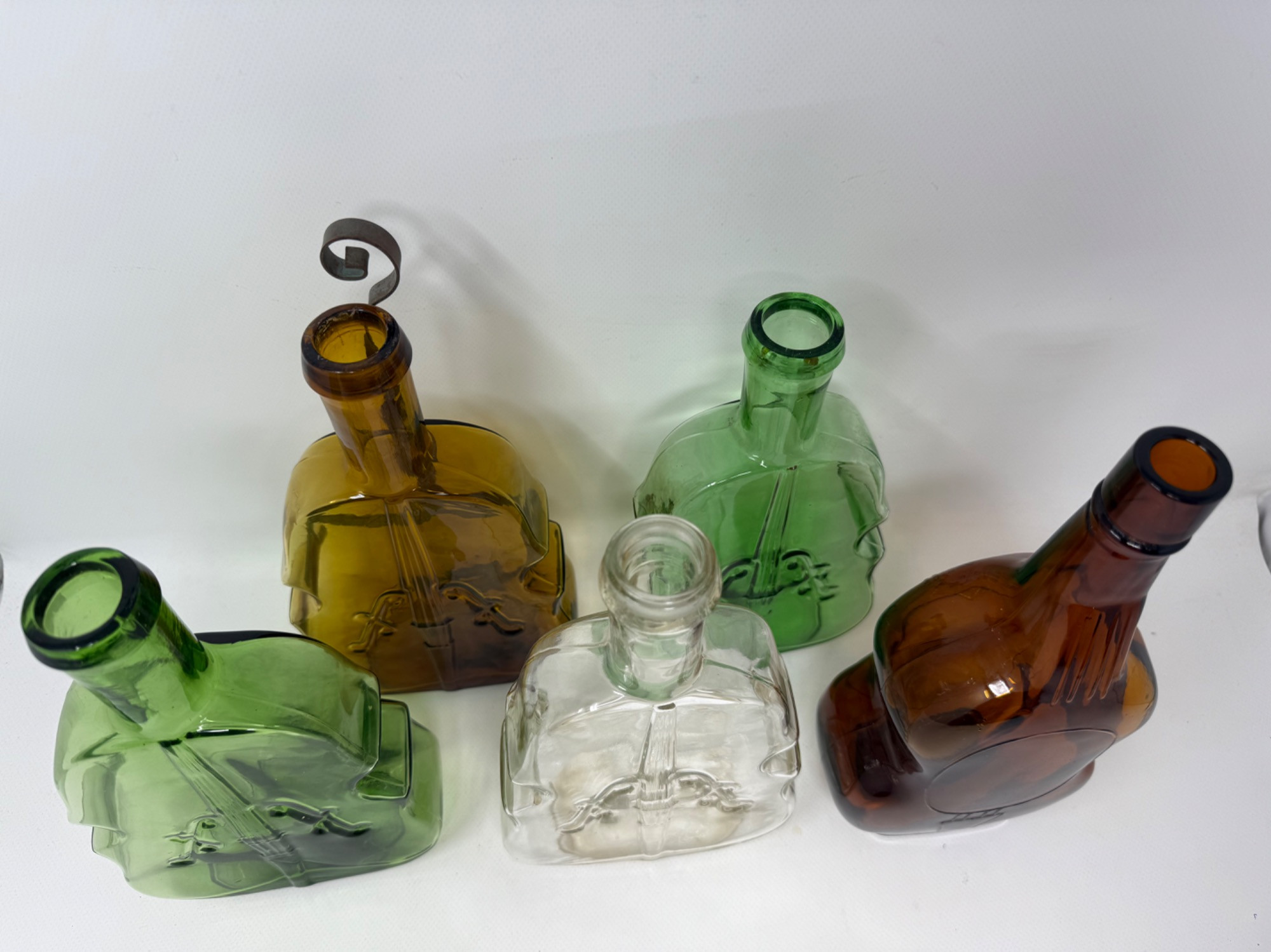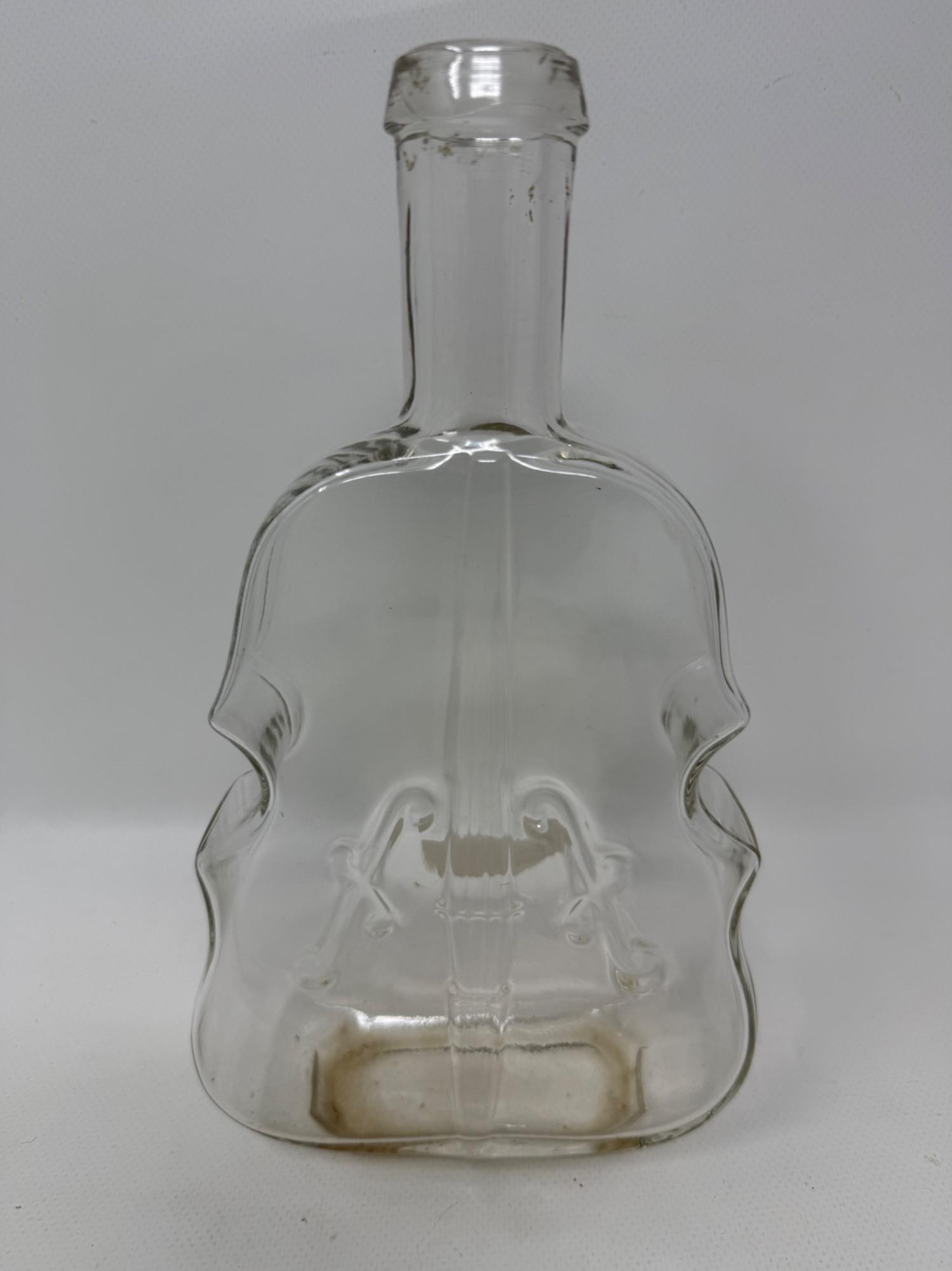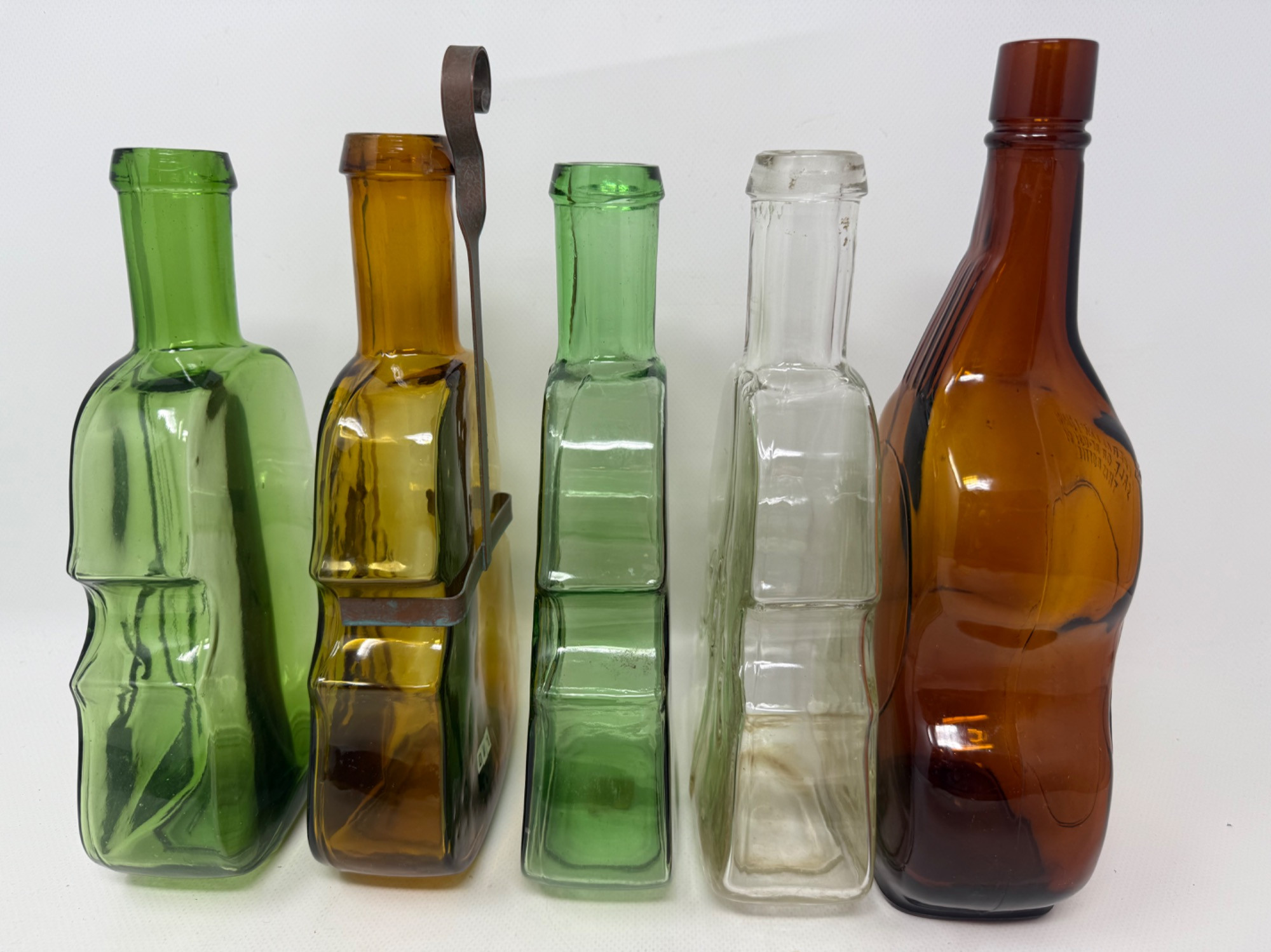 Large violin bottles. Clear, green, amber. One hook included. Average is 11in tall. Vintage styles bottle rims. One is a vintage liqueur bottle