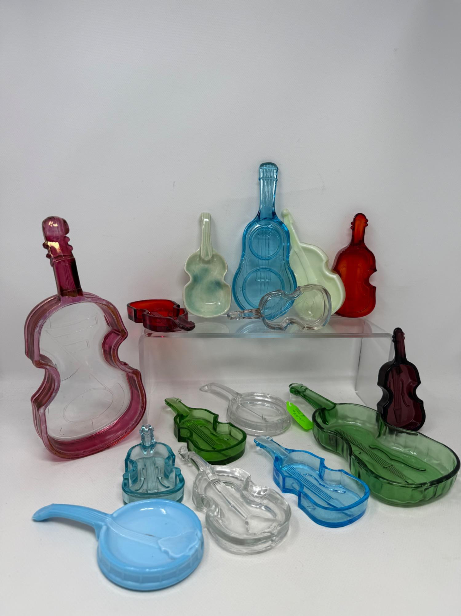 Several Violin Bottle Ashtrays and Candy Dishes Assorted styles and glass compositions. Largest size-10.5in tall, 4.5in wide