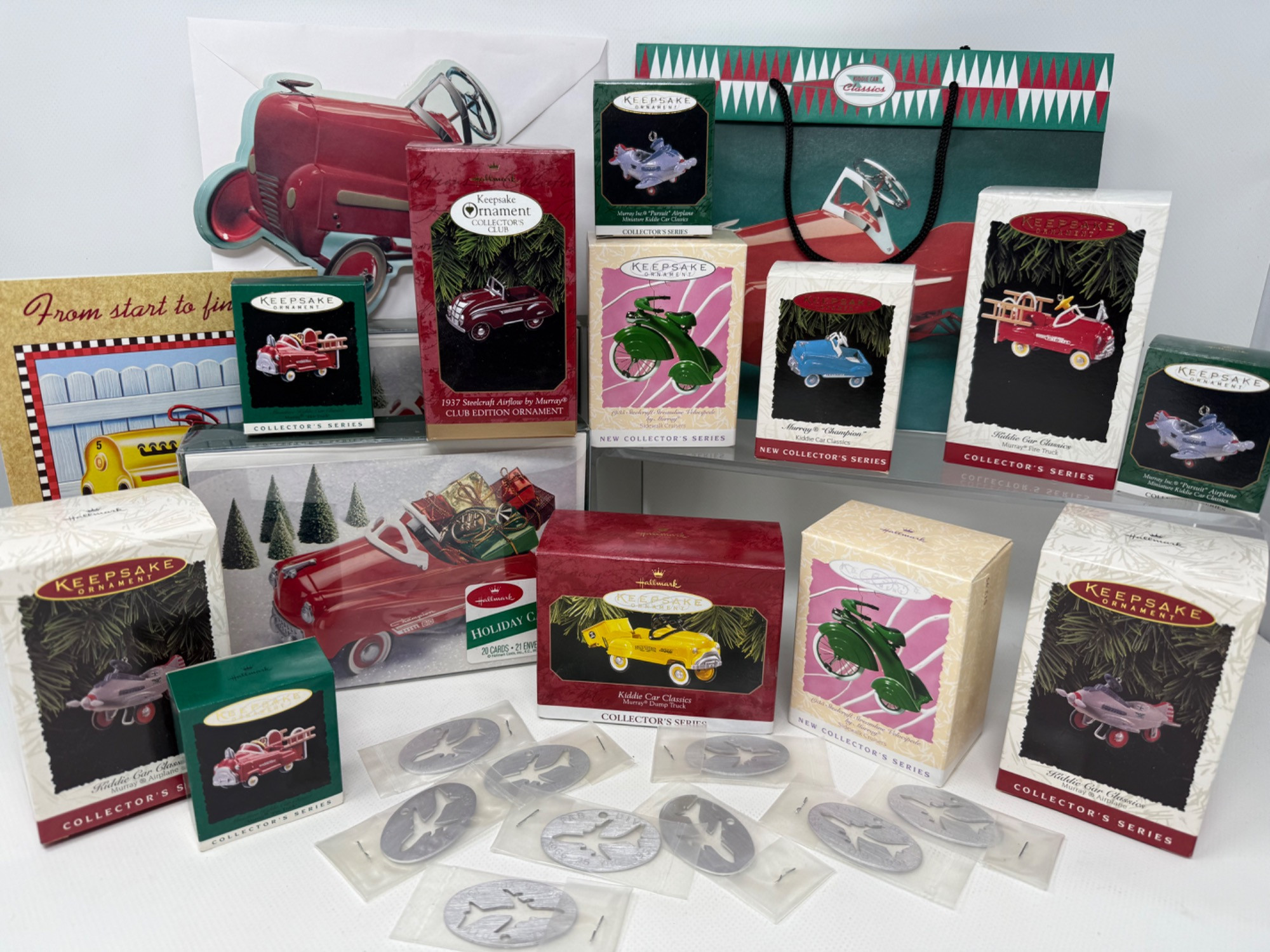 Several Vintage Hallmark Kiddie Car Ornaments. Holiday cards, cards, metal cut-outs. Metal die cast ornaments