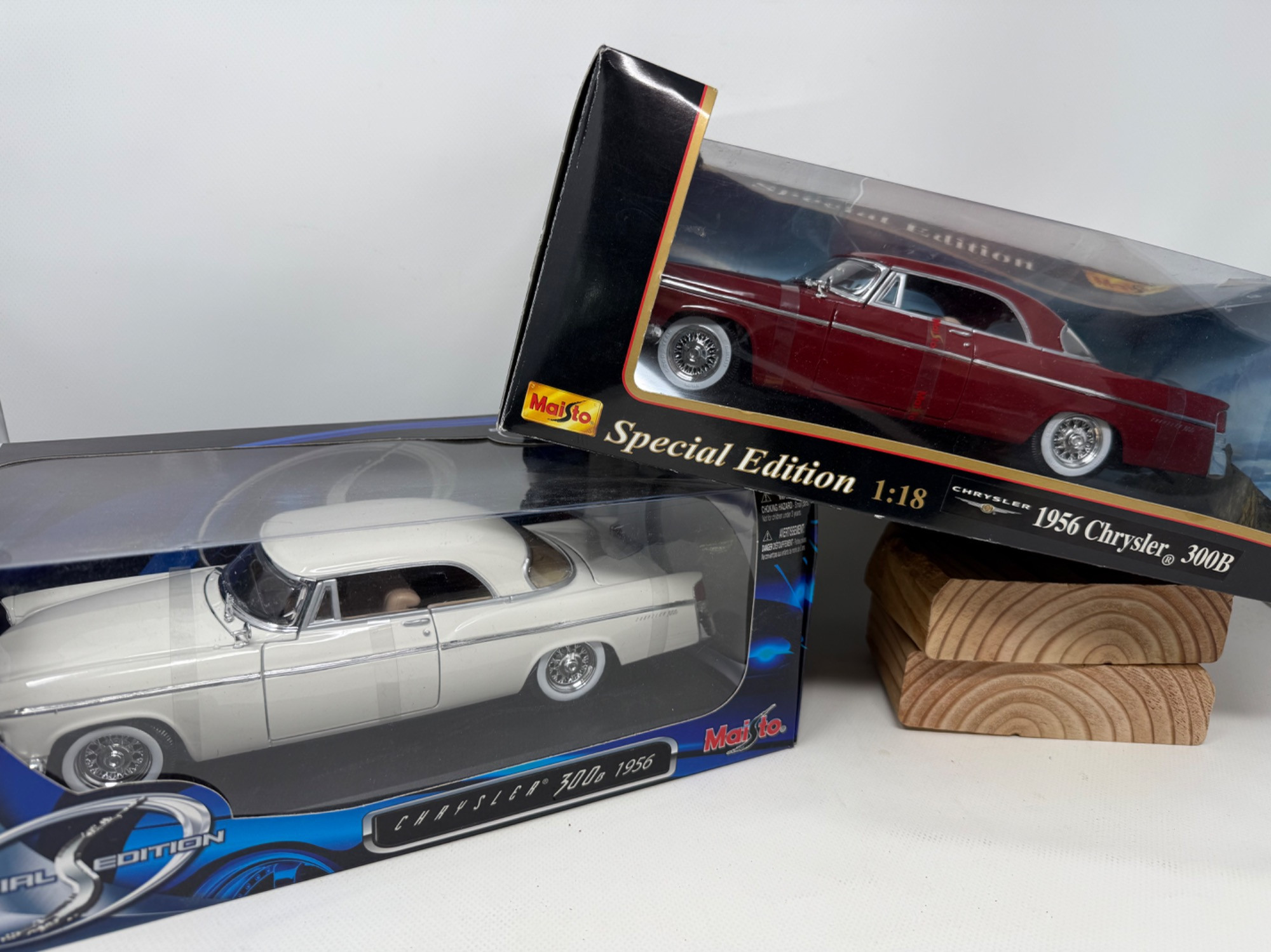 NIB model cars. 1:18 scale Die cast cars 1956 Chrysler 300B in white and crimson