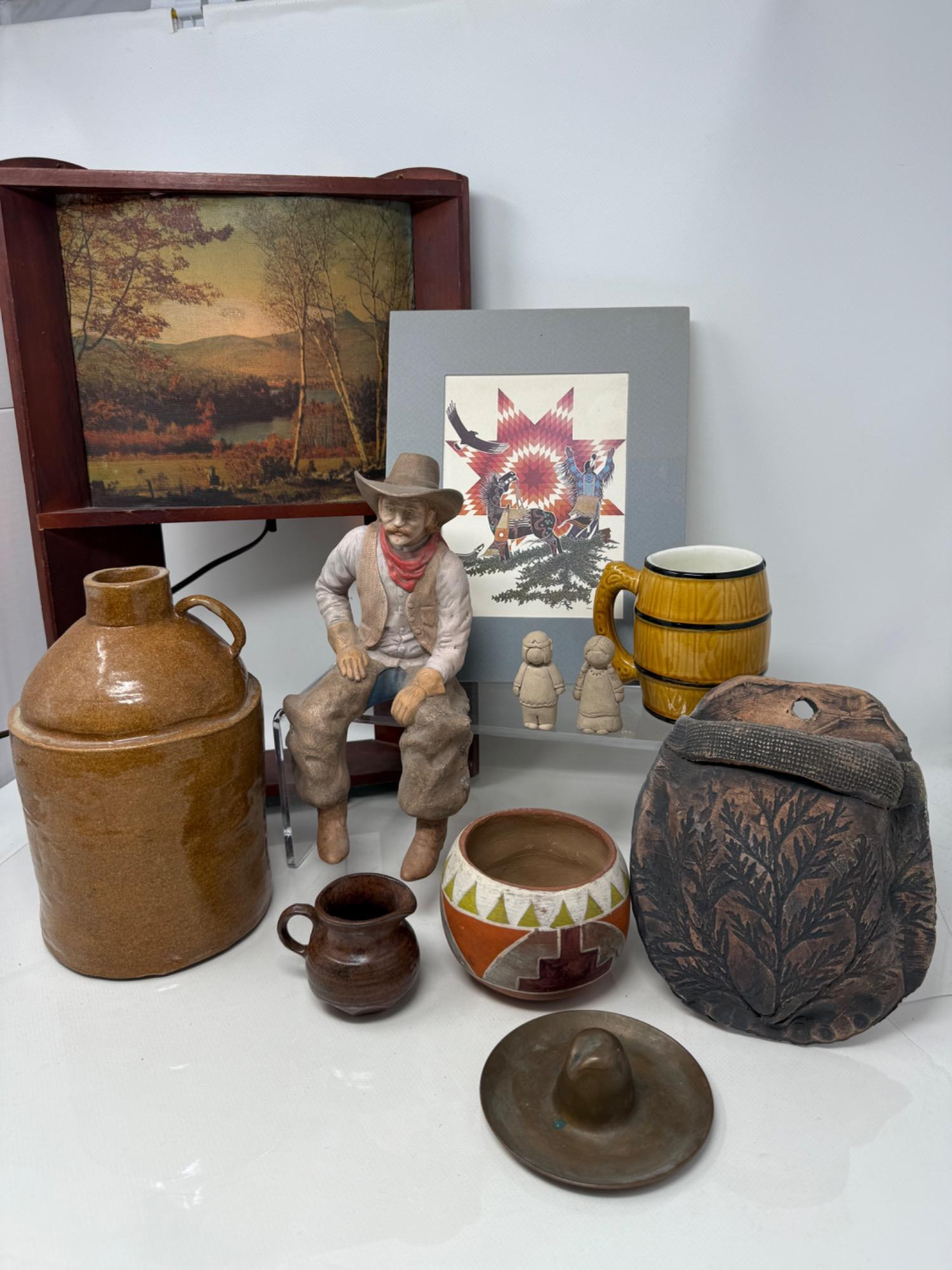 Vintage lamp with paper inserts. Looks interchangeable. Wood frame Handmade pottery bowl and wall vase. Brass sombrero Small whiskey jug and mug. Ceramic cowboy and more.