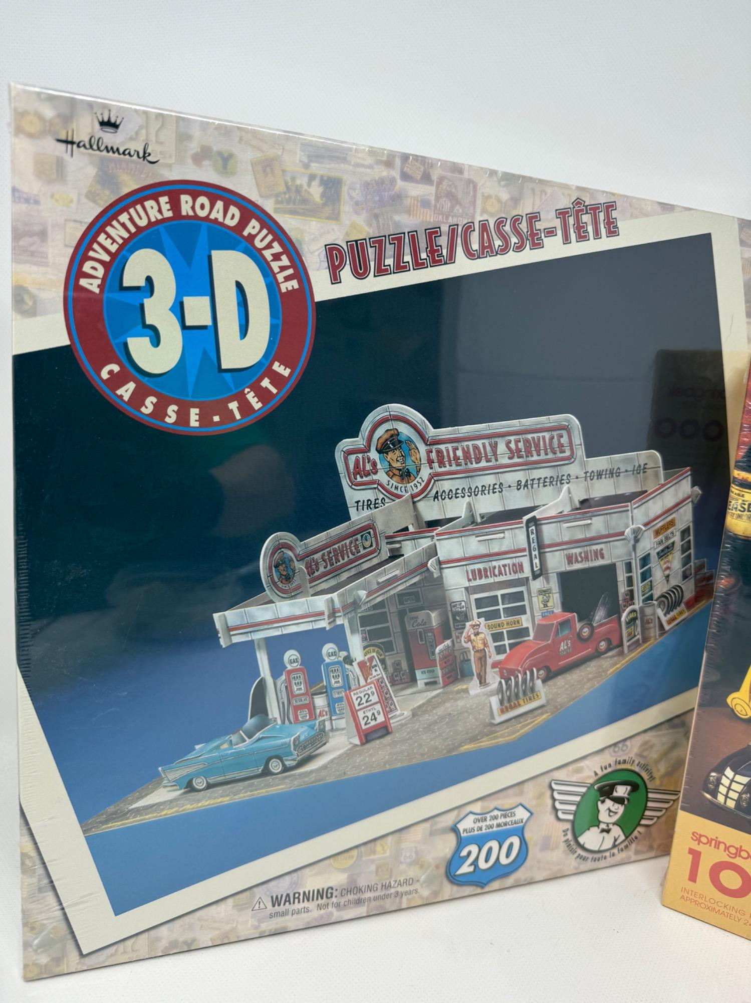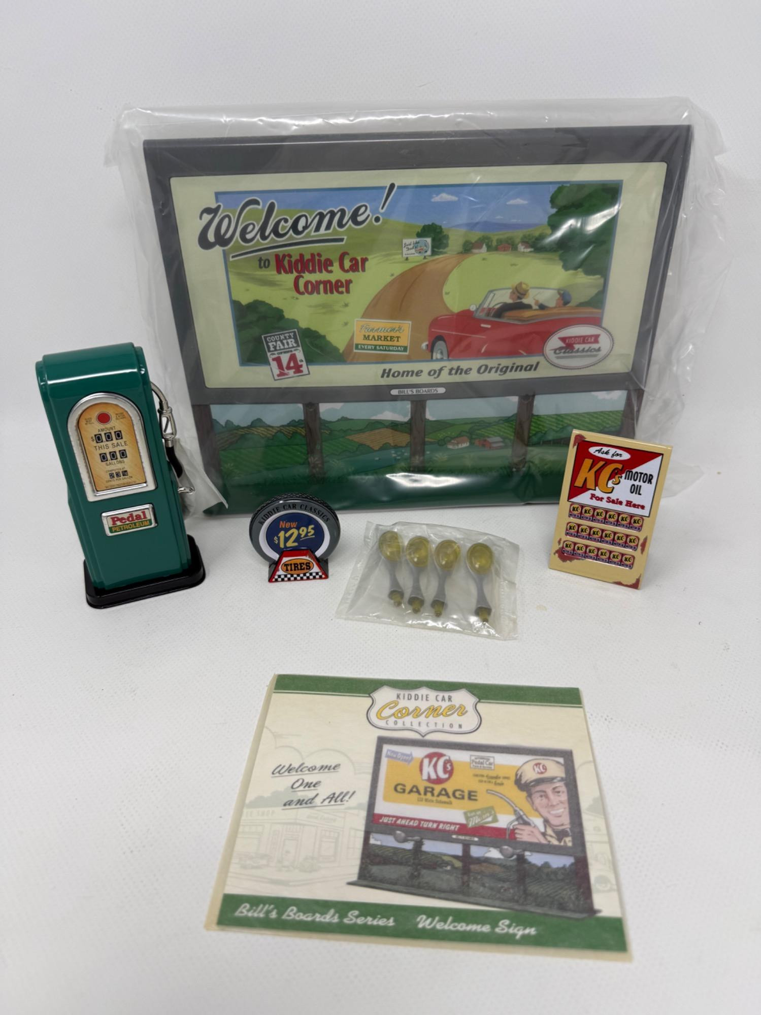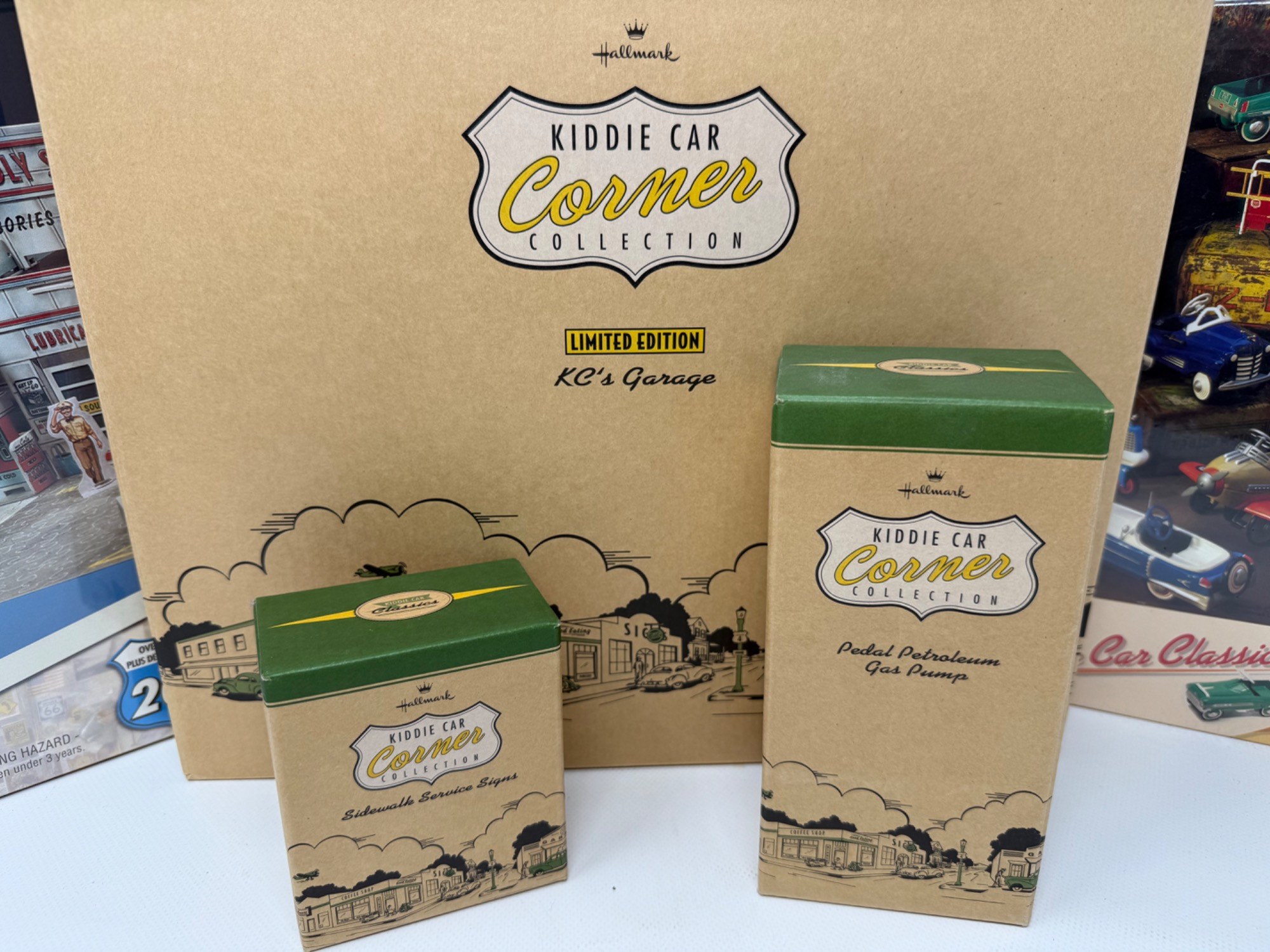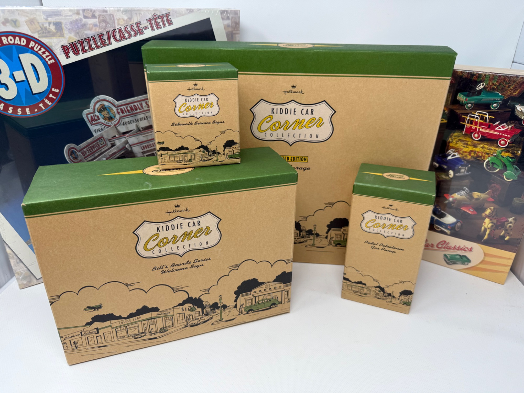NIB Hallmark collectibles for Kiddie Classics. Same as lot #110, minus one pump. Puzzles, signage and garage for putting a village together.