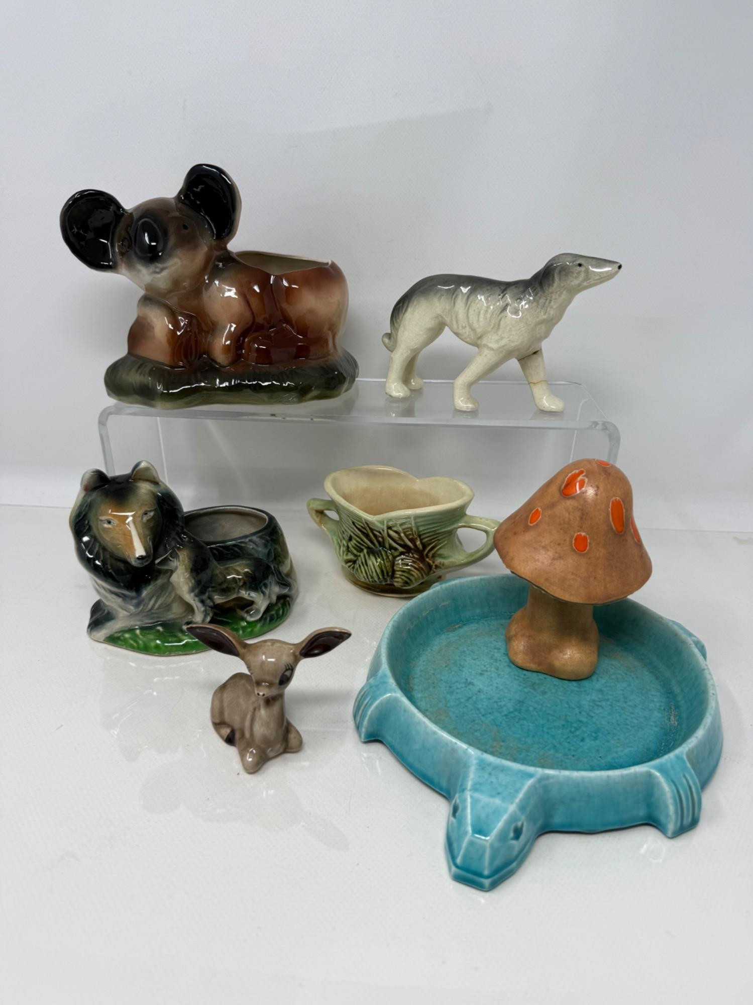 Vintage McCoy dog pot, turquoise ceramic turtle ashtray, ceramic mushroom, ceramic deer, dog and koala pot. Ceramic dog has a repaired leg. Made in Japan.