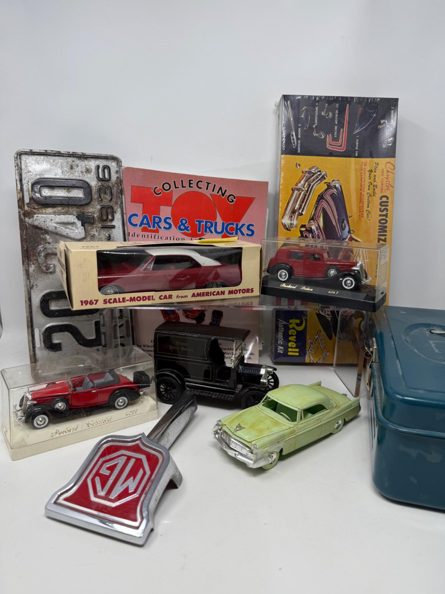 Car toy collectors' catalog. Regular and Small license plates. Plastic and metal cars, kits. Vintage tool box and MG pedal.