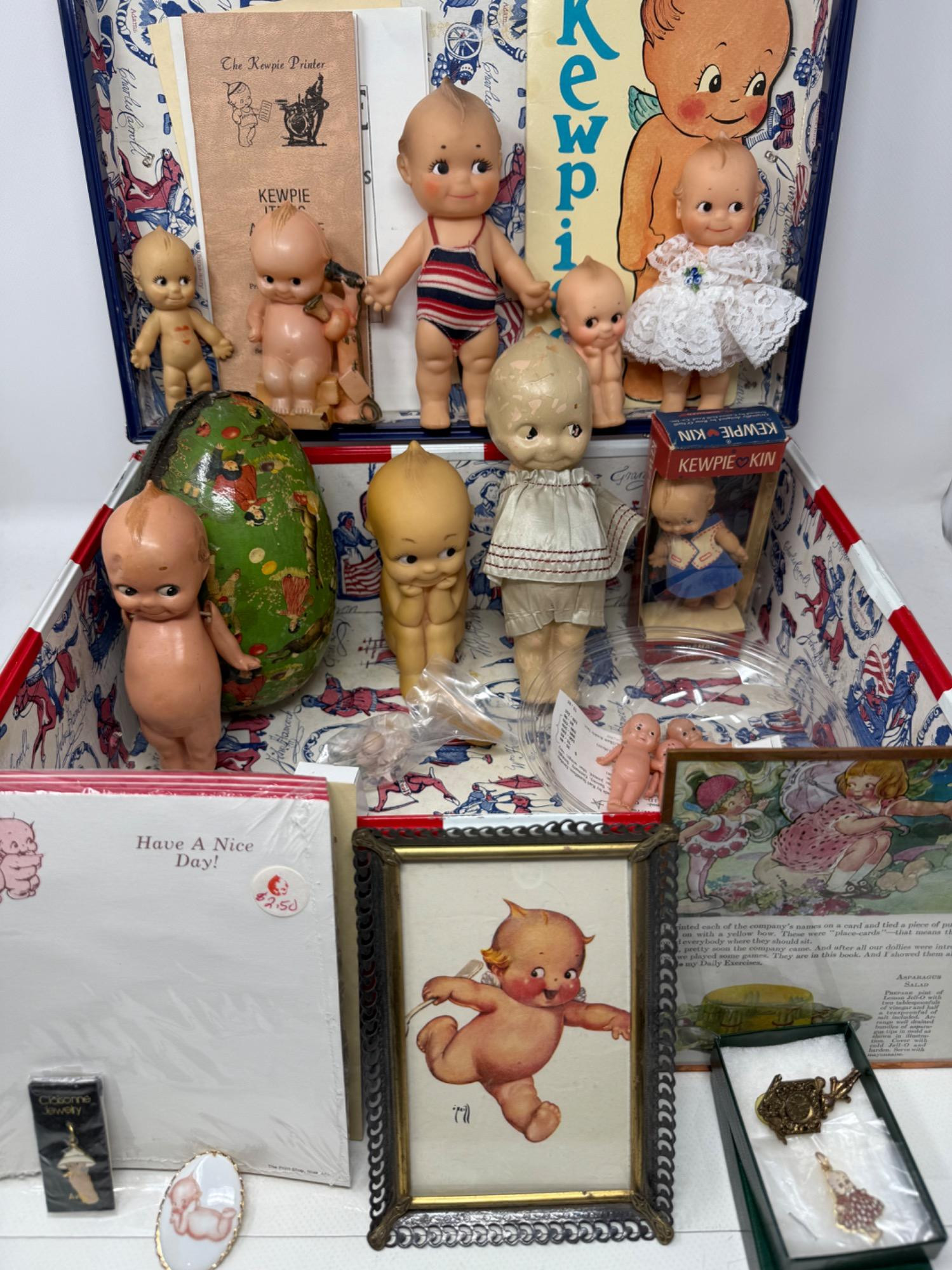 Large Kewpie collection. Americana metal suitcase. Small collectibles, paper products, framed prints. Vintage celluloid mini dolls. Porcelain hinged doll, rubber and plastic dolls. Variety of cameo kewpie dolls in all sizes. Some have aged.