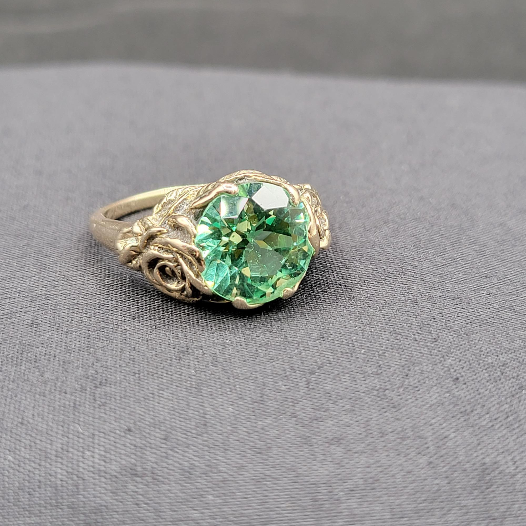 Stunning green Sapphire solitaire ring. Stone has outstanding fire. Hand made 10k gold rose and leaf motif setting. Unique designed prongs. Size 9. The stone is approximately 10mm. Total weight is 5.1 grams.