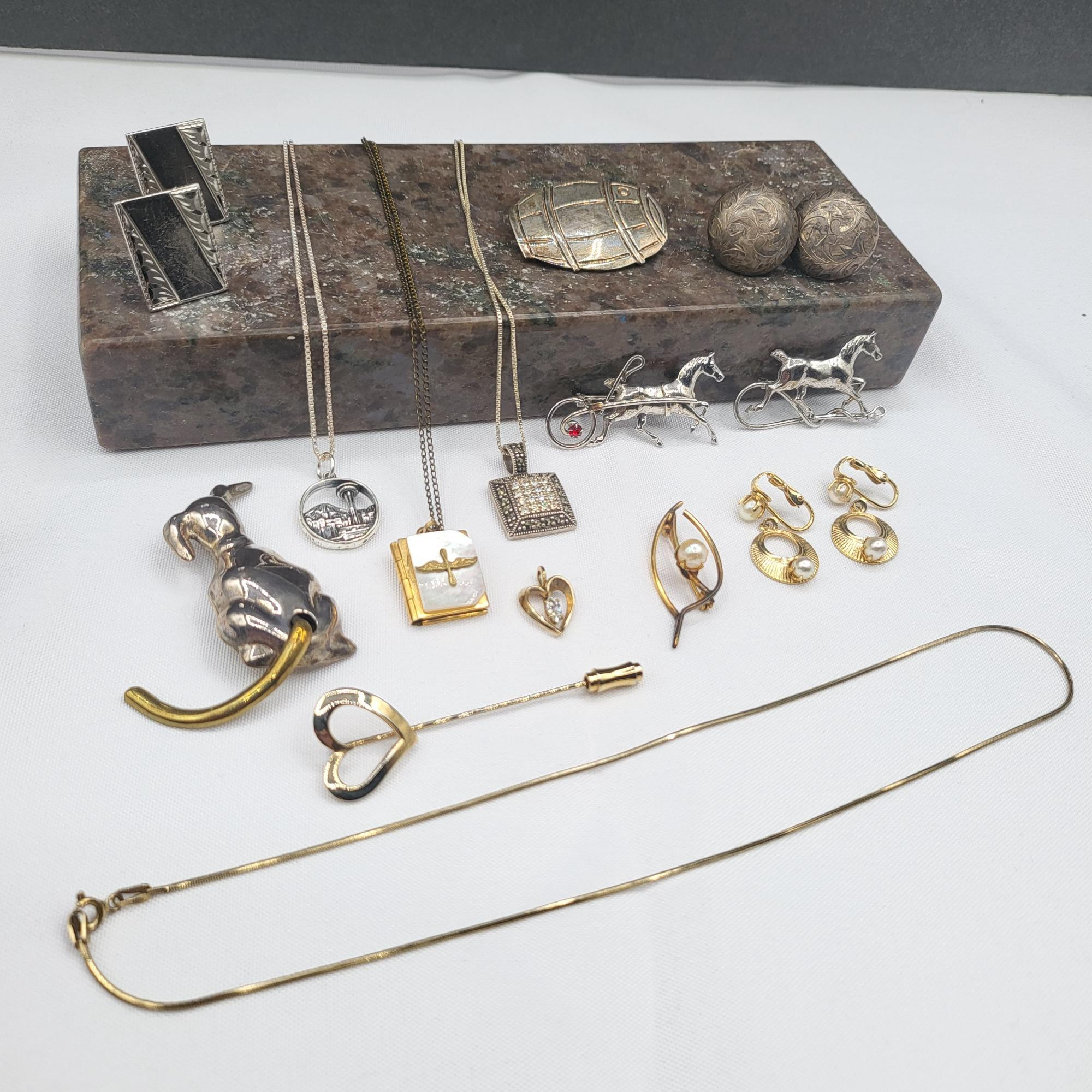 Various sterling silver jewelry - pins, earrings, necklaces and cufflinks. Total weight is 65 grams sterling. There is also some gold filled and genuine pearls. 925 dog pin with articulated tail. Antique etched sterling button screwback earrings. Sterling barrel pin. Two sterling horse pins. Sterling Seattle pendant necklace. 925 chain and marcasite square pendant. Several pieces gold filled jewelry and genuine pearls.