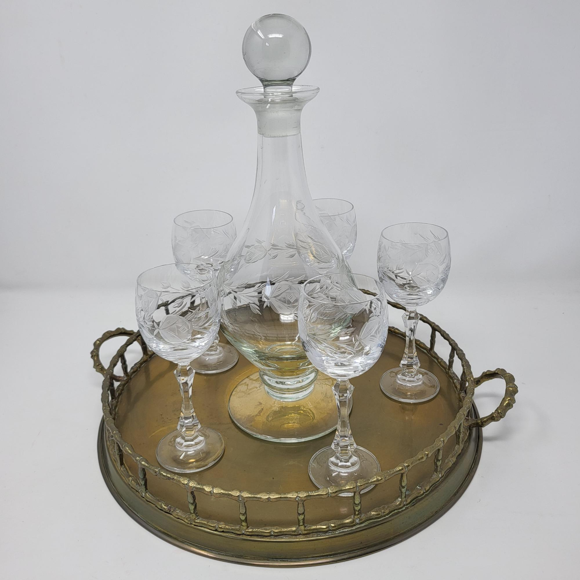 Elegant floral etched clear crystal wine glasses (6 inches tall) and decanter (12 inches tall) with stopper. Vintage round brass tray with handles. 12 inch diameter.