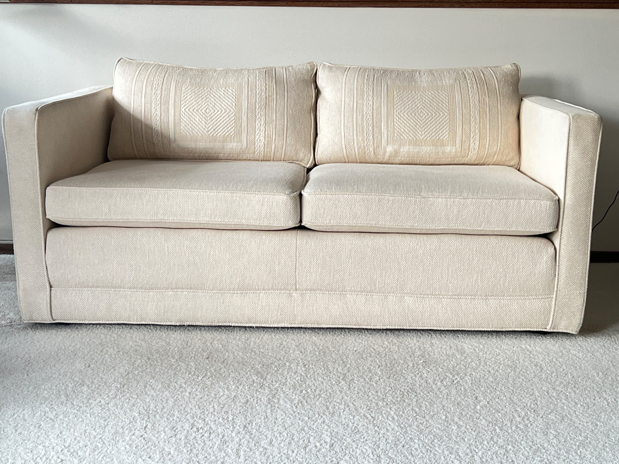 Two seat sofa with classic, clean-lined design. Mid century modern and originally purchased from Frederick and Nelson of Seattle. Thick, squared arms and the upholstery is a linen or similar blend. Frederick & Nelson was a department store known for carrying a variety of furniture styles over its long history. (1890 to 1992). Bidding on this lot is an agreement that: (1.) You will have 2 capable, able-bodied persons to lift and load at a minimum. (2.) You