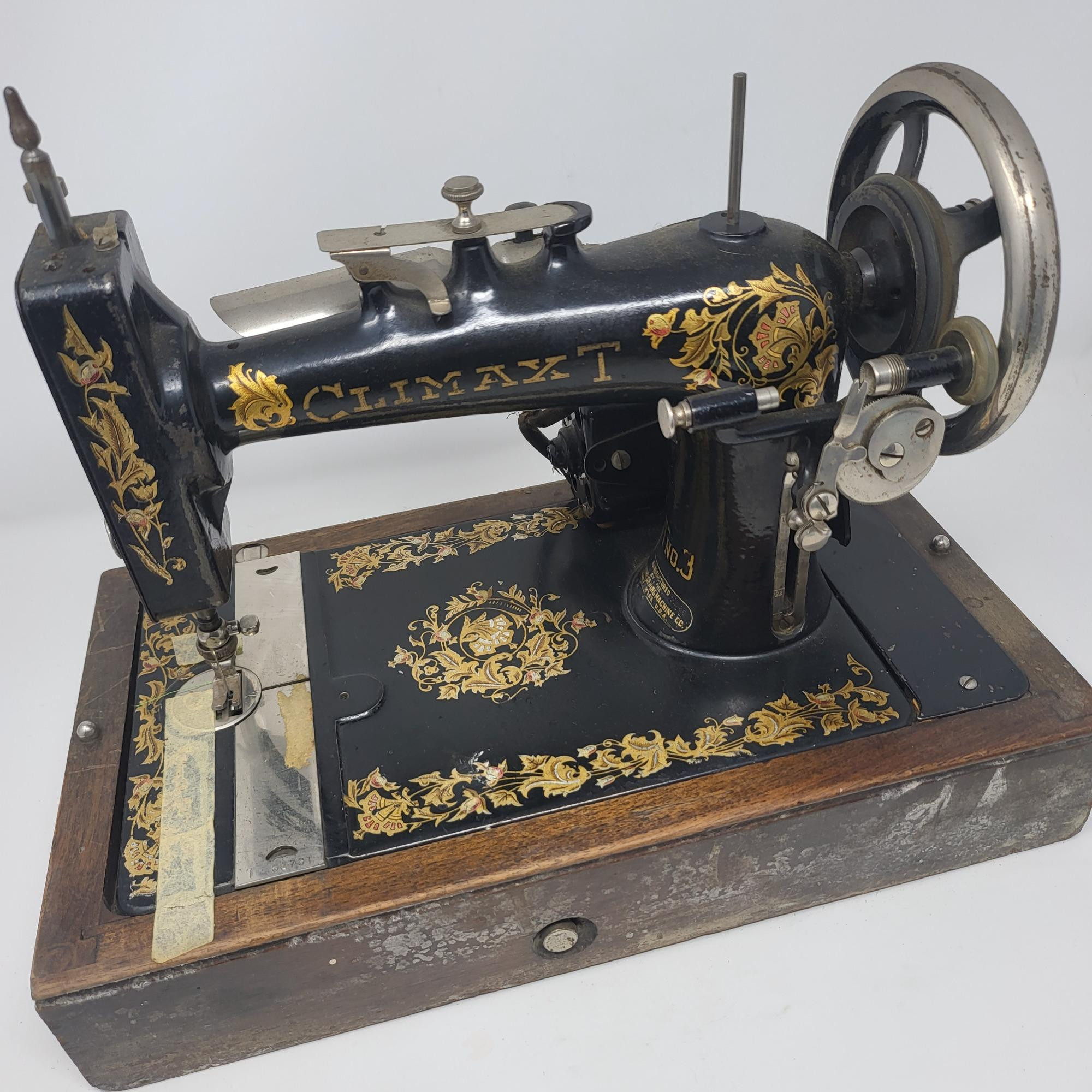 The Climax T No. 3 sewing machine is a vintage model produced by the New Home Sewing Machine Company. This early 20th-century machine is known for its durability and craftsmanship. Comes with the wooden carrying case, and original foot pedal.
