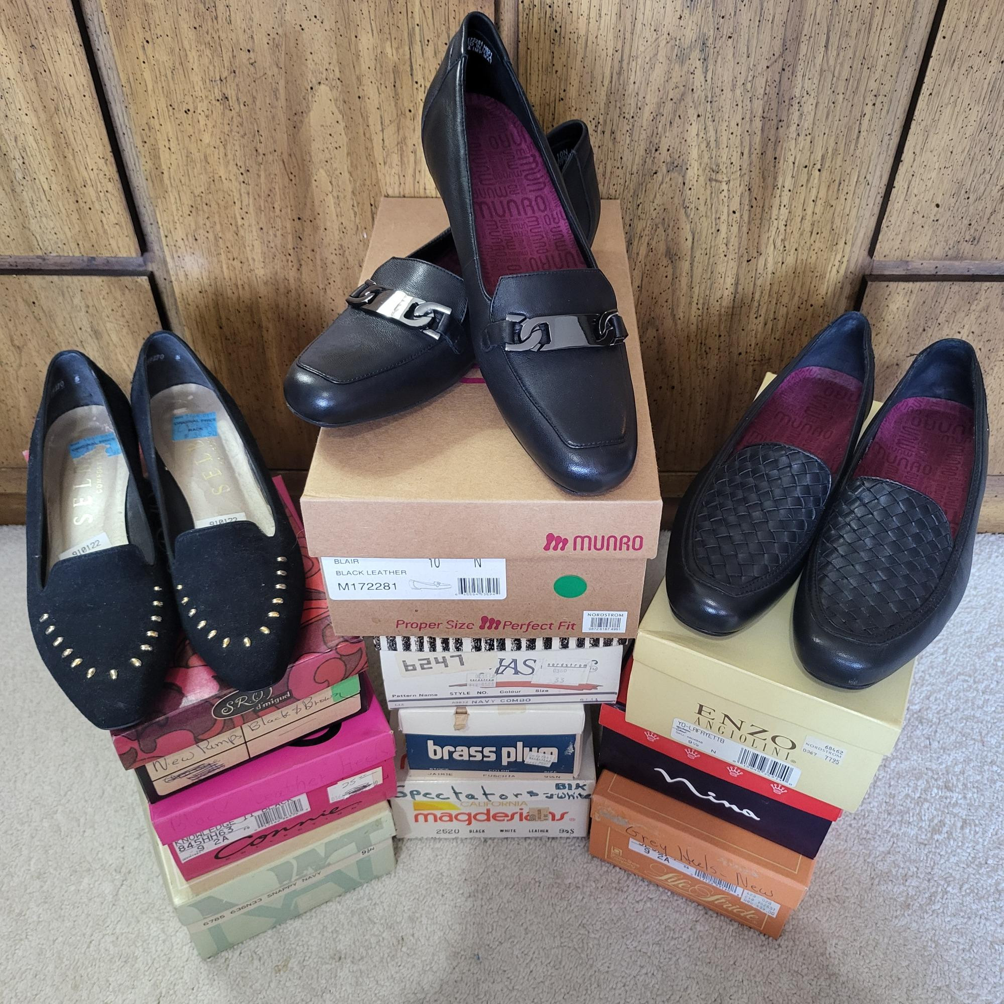 Several pairs of shoes stored in individual shoe boxes. Heels, pumps, loafers and more. Some brands are brass plum, Calico, Connie, Munro and many more. Sizes range 9, 9.5, 10.
