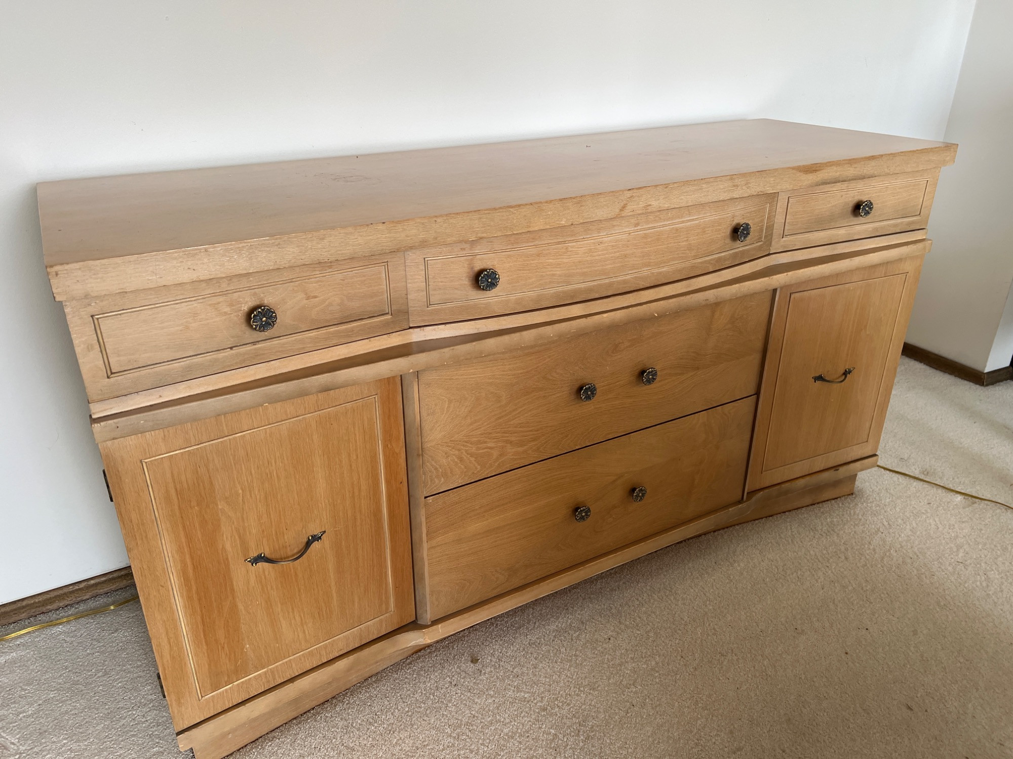 Mid century blonde wood Distinctive Furniture by Stanley Buffet with two side cupboards and five drawers. Lots of storage capability. Original hardware. Bidding on this lot is an agreement that: (1.) You will have 2 capable, able-bodied persons to lift and load at a minimum. (2.) You