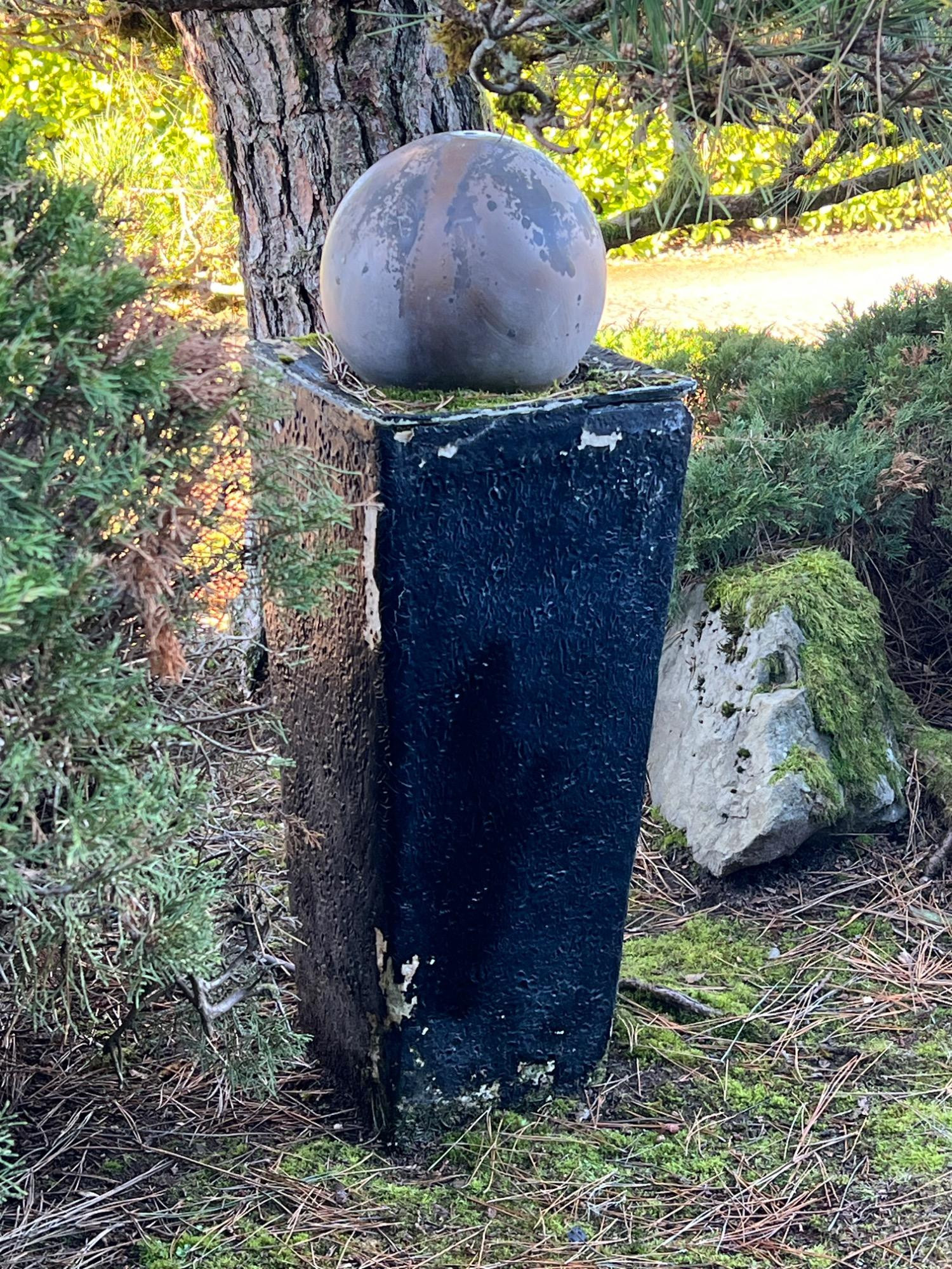 Rustic pedestal fountain with sphere top. Buyer must dismantle and move fountain. 6 steps to ground level.