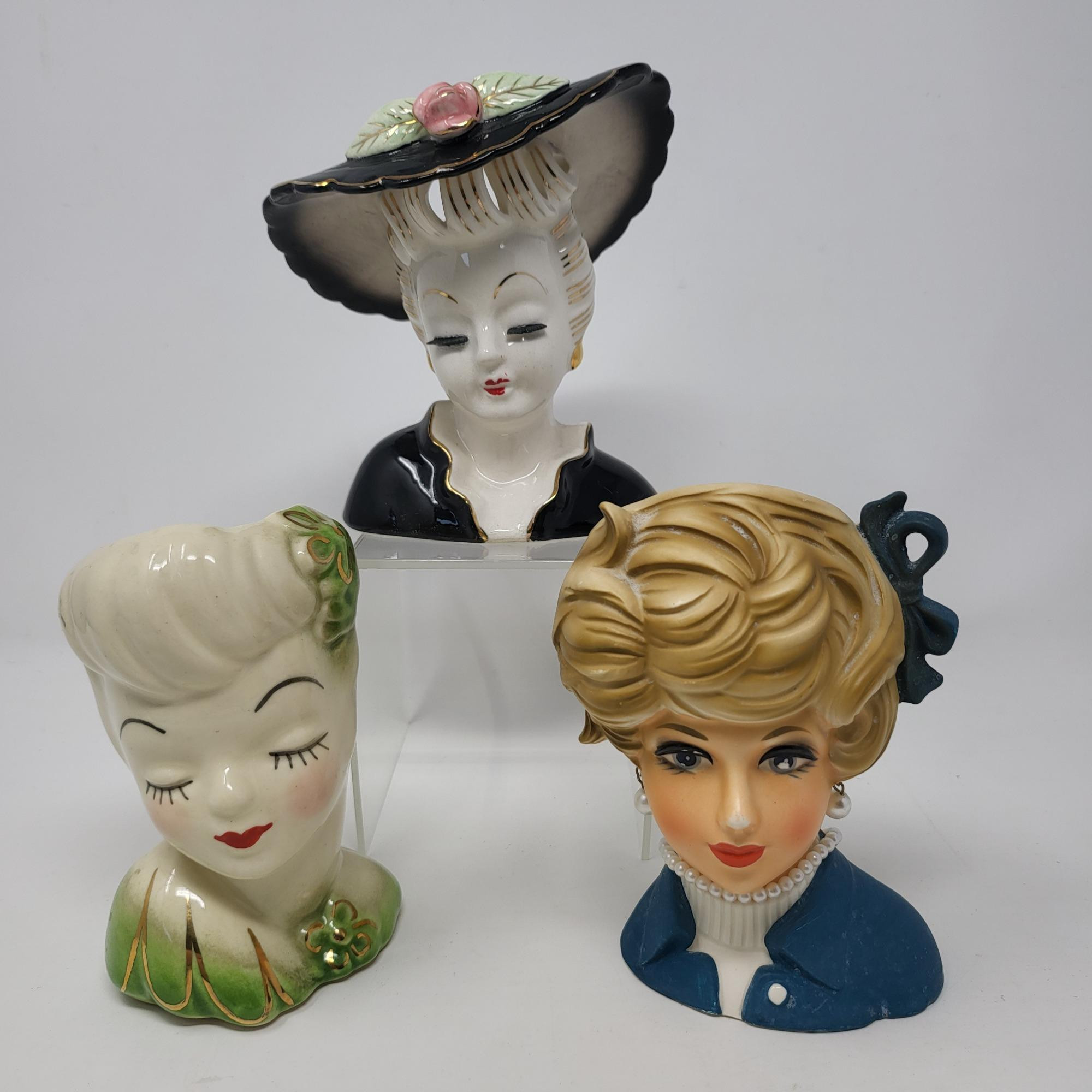 Napco mid-century ceramic decorative planters. 1950's. Three 5" - 6" ceramic women busts made in the USA. Betty Gable, Lady in Black Hat (may be Artco) and Napcoware Blonde Head Lady.