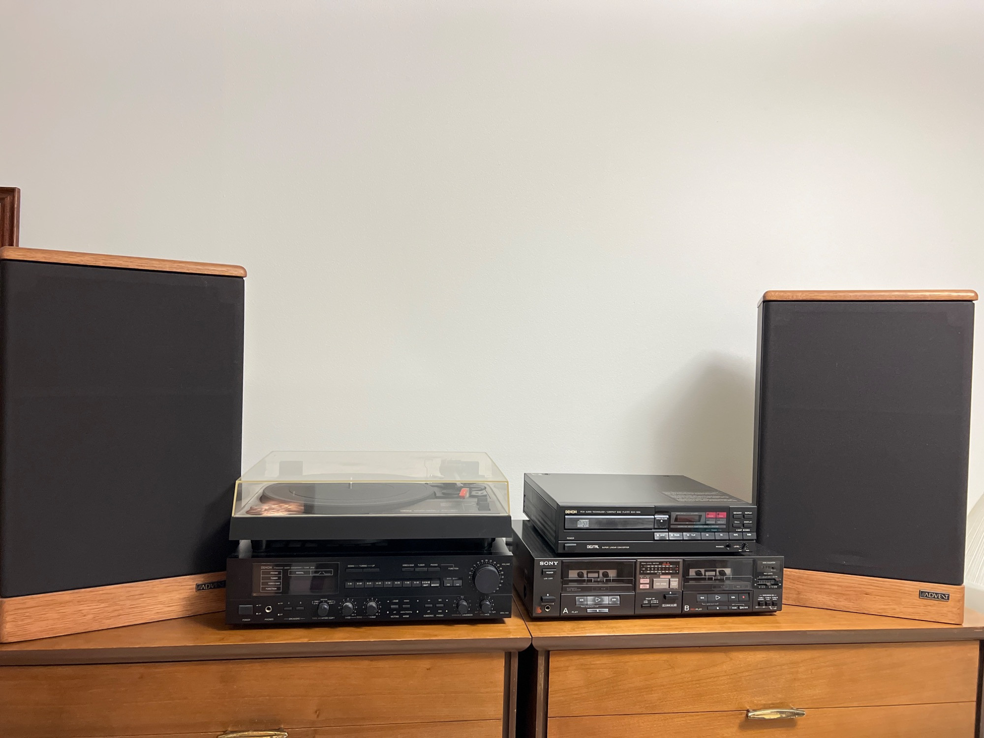 Complete stereo system that includes Tape and CD player, phonograph player, receiver with am/fm radio, and two speakers.