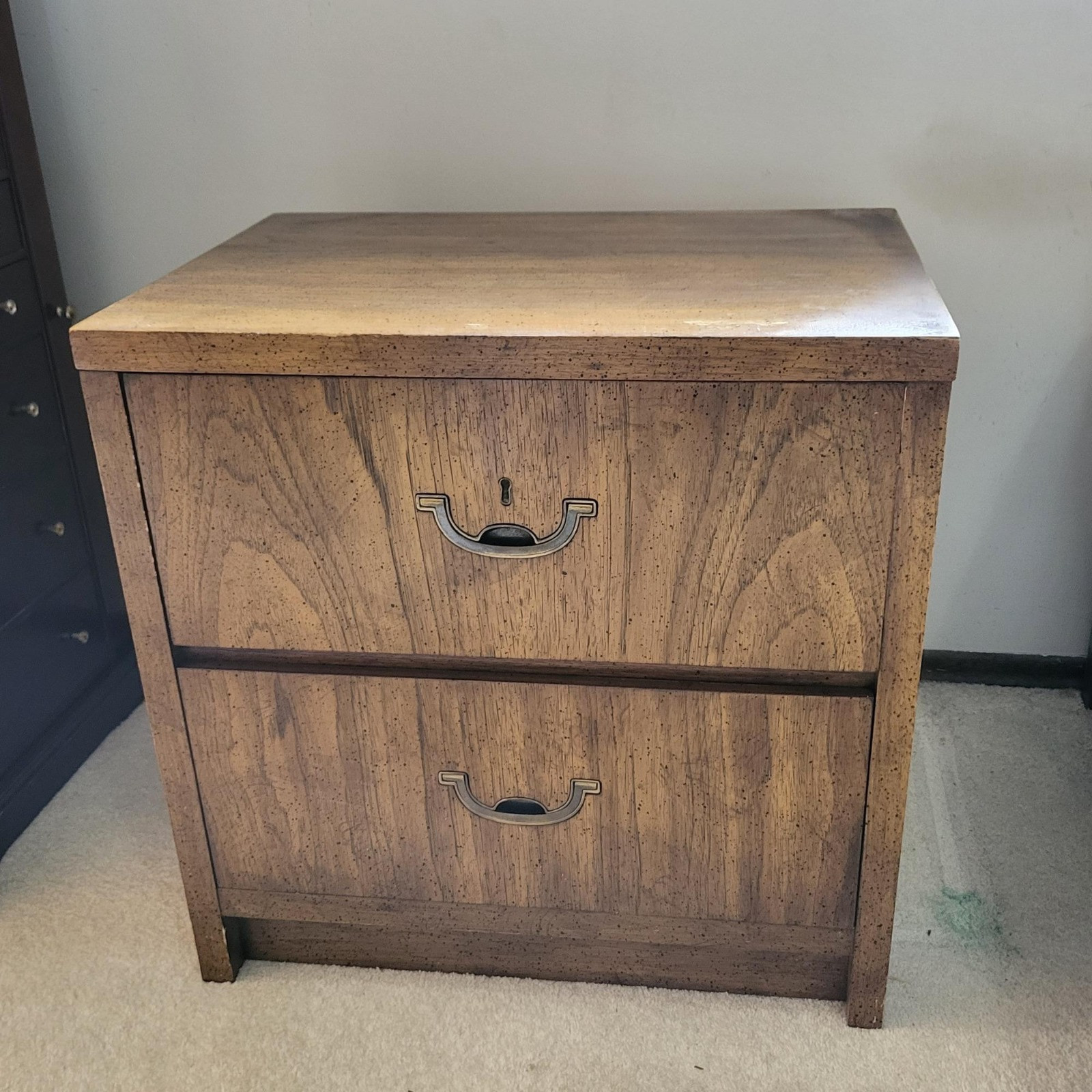 Two drawer Dixie Citation bedroom side table. Original hardware. Coordinates with dressers also found in this auction. Located on second floor that includes 8 steps to front door and 6 concrete steps to driveway. Bidding on this lot is an agreement that: (1.) You will have 2 capable, able-bodied persons to lift and load at a minimum. (2.) You
