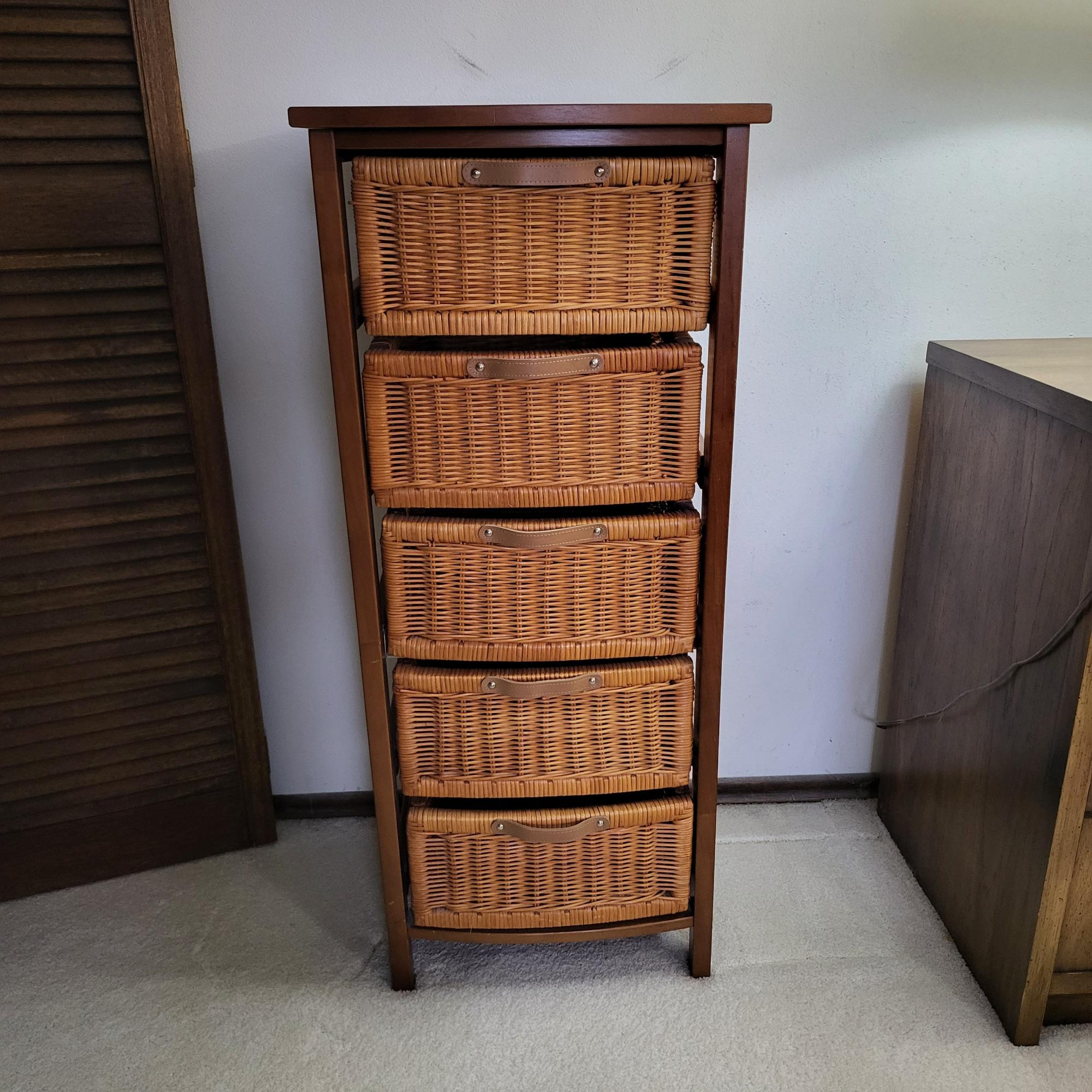 Five sturdy wicker drawers that slide into a dark wood frame.