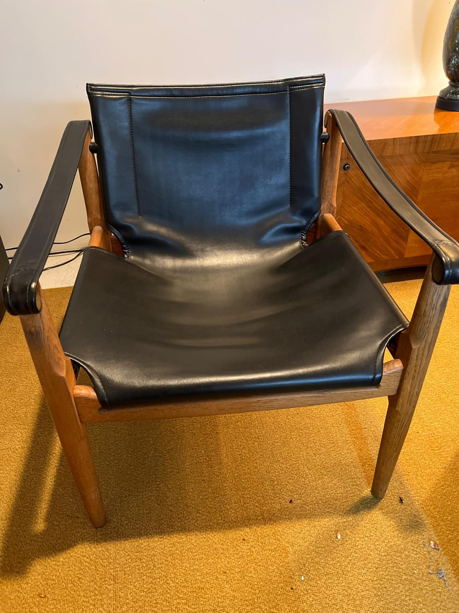 Mid century oak and leather sling chair. Douglas Heaslett? Slight cracking in leather at corner of arms (front) - see pictures. Does not affect the actual use of the chair.