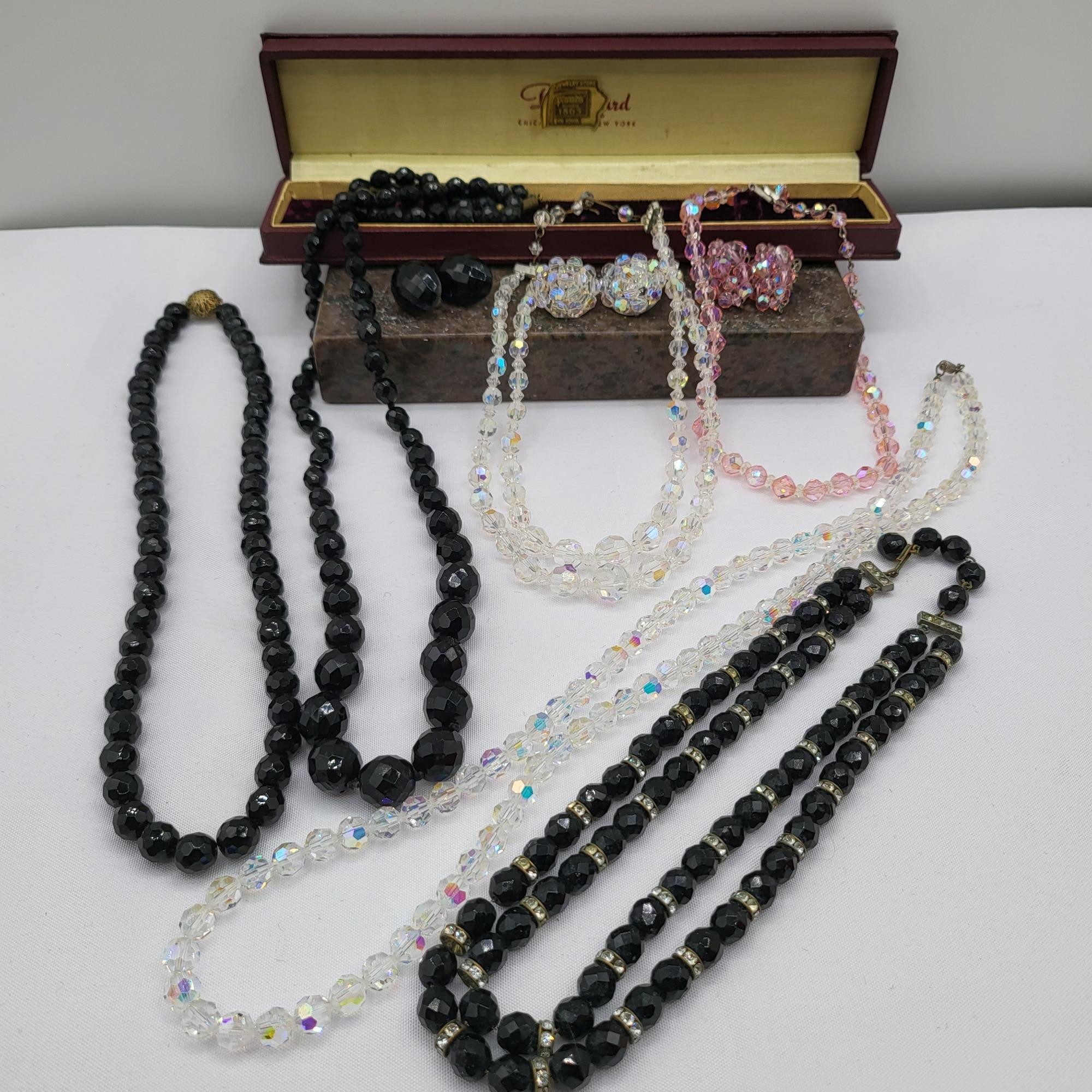 Six stunning faceted crystal bead necklace strands, chokers and three pairsclip earrings in jet black, clear and pink aurora crystals. Pink choker is by Laguna. Length range from 14" to 34". Three are single strand, two are double strand.
