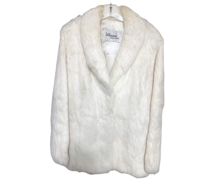 Wilson's Suede & Leather distribution of vintage white rabbit fur jacket. This jacket was made in Korea with fur acquired in France. The jacket has a 100% acetate creamy white lining. Side pockets fully lined. Soft fur. Exquisitely fashioned. Slight tailoring at waist. Size Large. Dry clean only using the fur method.