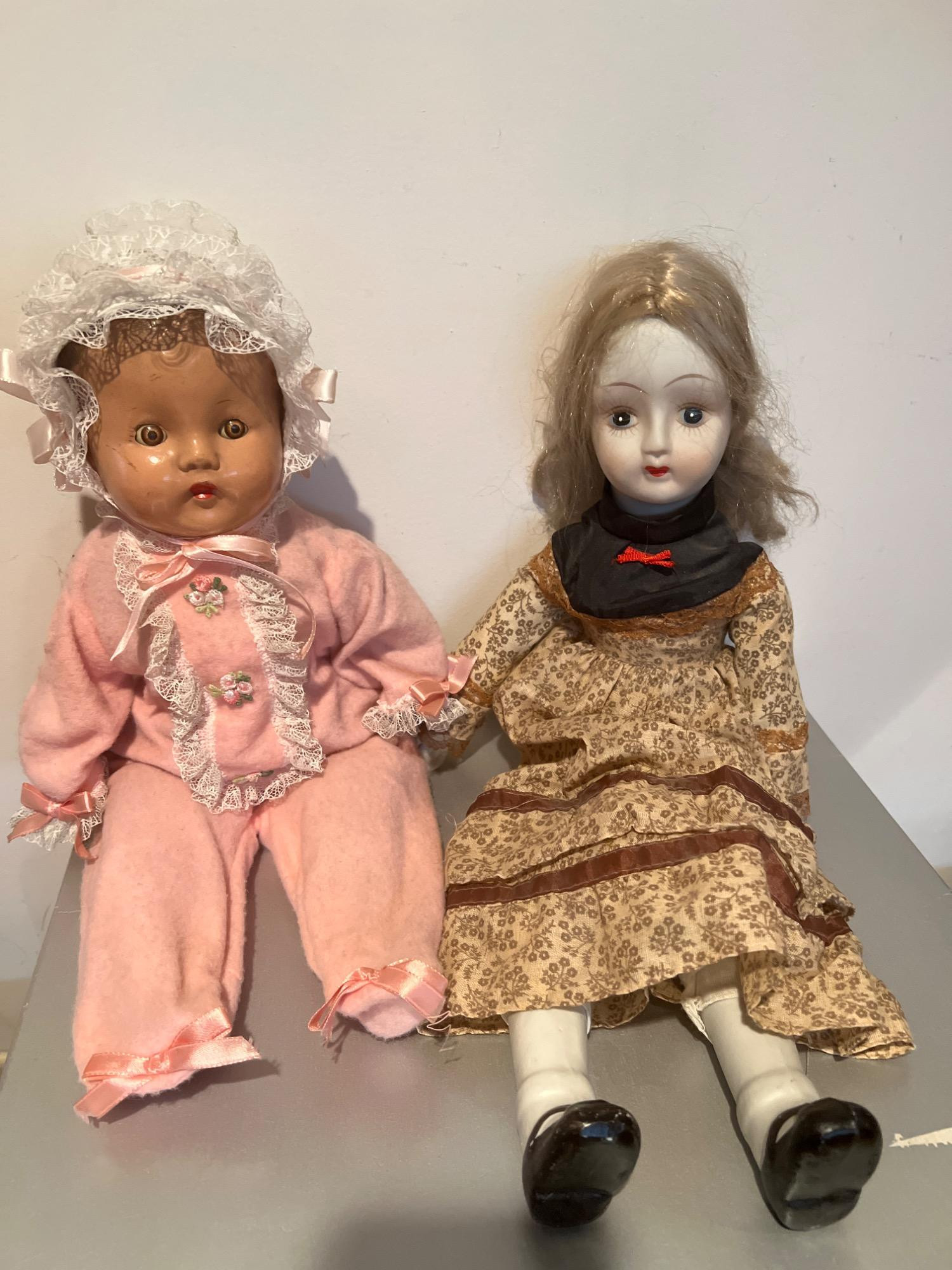 Two dolls - one old composite (believed to be made in Germany) and the other bisque porcelain. 12" and 14" tall
