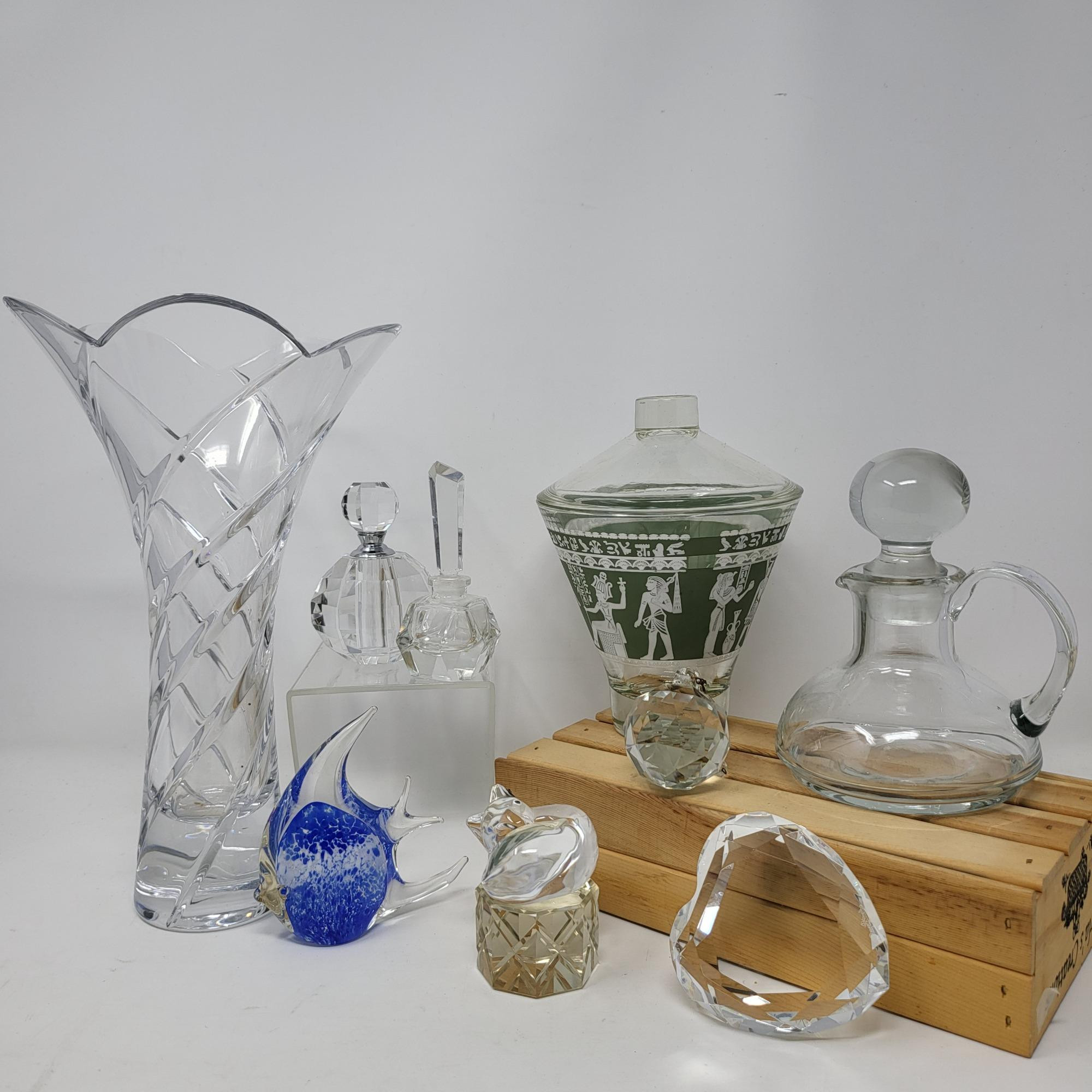 11" crystal vase with scalloped top, MCM Greek pattern covered glass dish, cruet with glass stopper, vintage perfume bottles by Irice and Simon Designs, blue glass angel fish, and more.