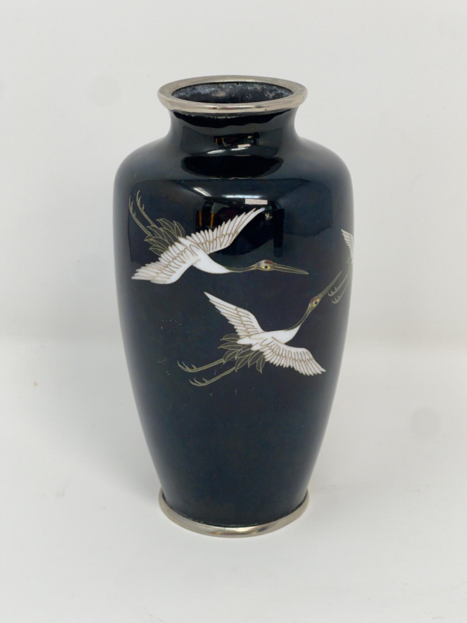Vintage Japanese SATO Cloisonné Vase – Small Black Enamel w/ Cranes This vintage Japanese SATO cloisonné vase features a sleek black enamel finish adorned with elegant flying cranes, symbolizing longevity and good fortune. Crafted using the traditional cloisonné technique, this small yet stunning vase showcases fine wirework and intricate enamel detailing. A beautiful addition to any Asian art collection, this piece is perfect for collectors of Japanese antiques, cloisonné, or decorative vases.