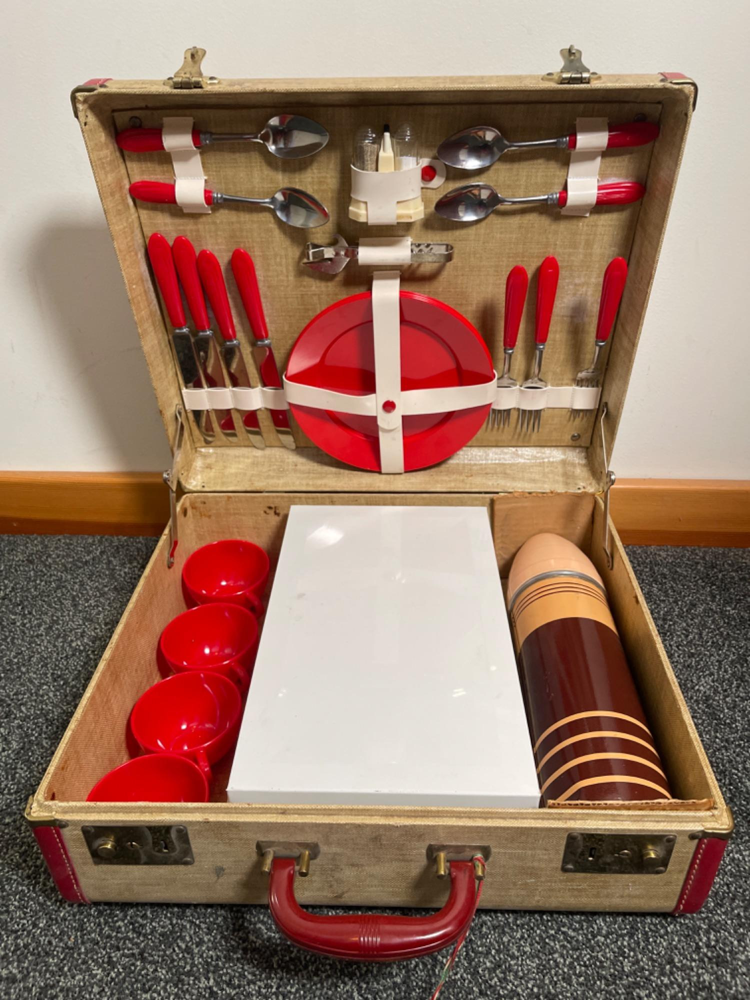 1940s Vintage Automotive Picnic Set – Missing 1 Fork This rare 1940s vintage automotive picnic set is a true collector’s item, perfect for classic car enthusiasts or lovers of retro outdoor gear. The set comes in a sturdy suitcase-style case with a woven fabric interior, holding a complete set of red-handled utensils, matching plates, cups, and essential dining accessories. Included in the set: A fantastic display piece or a functional vintage picnic set, perfect for road trips, car shows, or mid-century collectors. Bottle has dents and scratches, and case has staining. Please see photos.