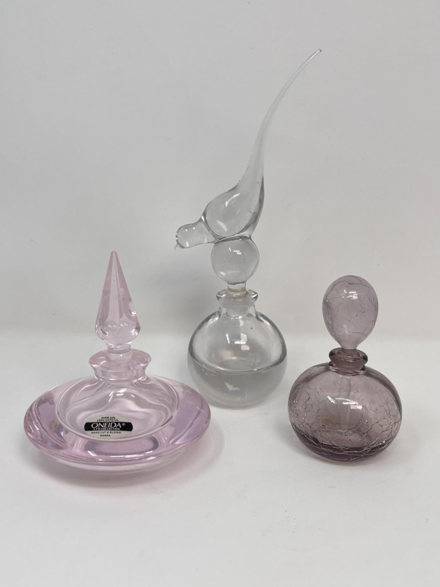 Elegant Vintage Glass Perfume Bottles This exquisite collection features vintage glass perfume bottles in various shapes, sizes, and delicate designs. The set includes beautifully crafted pieces, some with intricate hand-blown details, elegant stoppers, and subtle color variations such as soft pink, clear, and lavender hues. Among the collection is a Oneida Art Glass bottle, adding a touch of collectible value. All need cleaning, but are in good used condition.