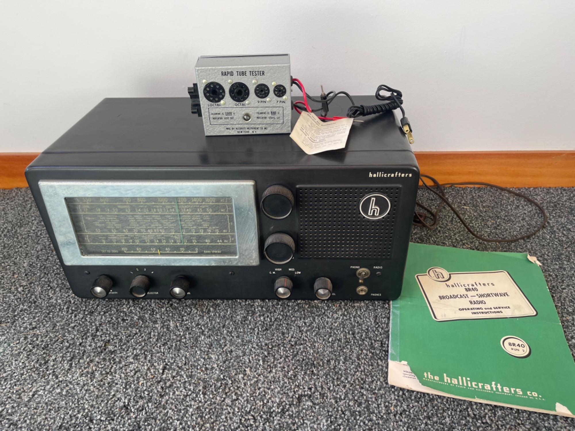 Vintage Hallicrafters 8R40 Broadcast Shortwave Radio (1950–1955) Step back in time with this Hallicrafters 8R40 Broadcast & Shortwave Radio, a highly collectible vintage tube receiver from 1950–1955. Known for its quality craftsmanship and performance, this radio features multiple tuning dials, band selection options, and a sturdy metal case. Includes the original manual, adding to its collector’s value. Sold as-is for restoration, display, or parts. A great find for vintage electronics enthusiasts and Hallicrafters collectors! UNTESTED.